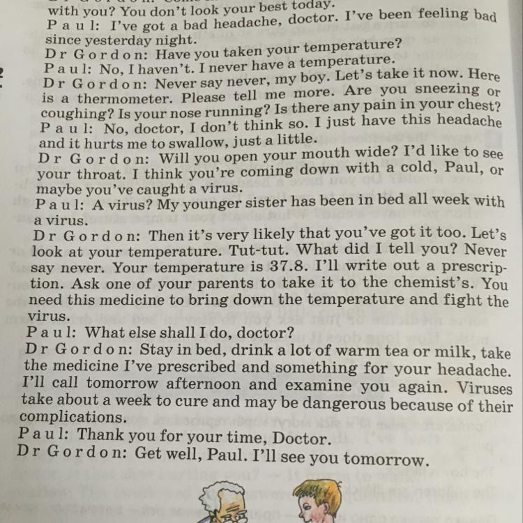Paul said to the doctor that he had got a bad headache. He had been feeling bad since the day before night. Doctor asked Paul if he had taken his temperature. Paul said to the doctor that he hadn`t. He never had a temperature.