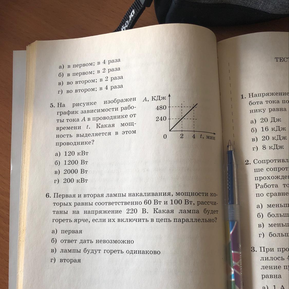 Объяснение: 5) N=A/t=480/4=120 кВт 6) R=U^2/P R1=220^2/60=806 Ом R2=220^2/100=484 Ом R1>R2 Вторая горит ярче