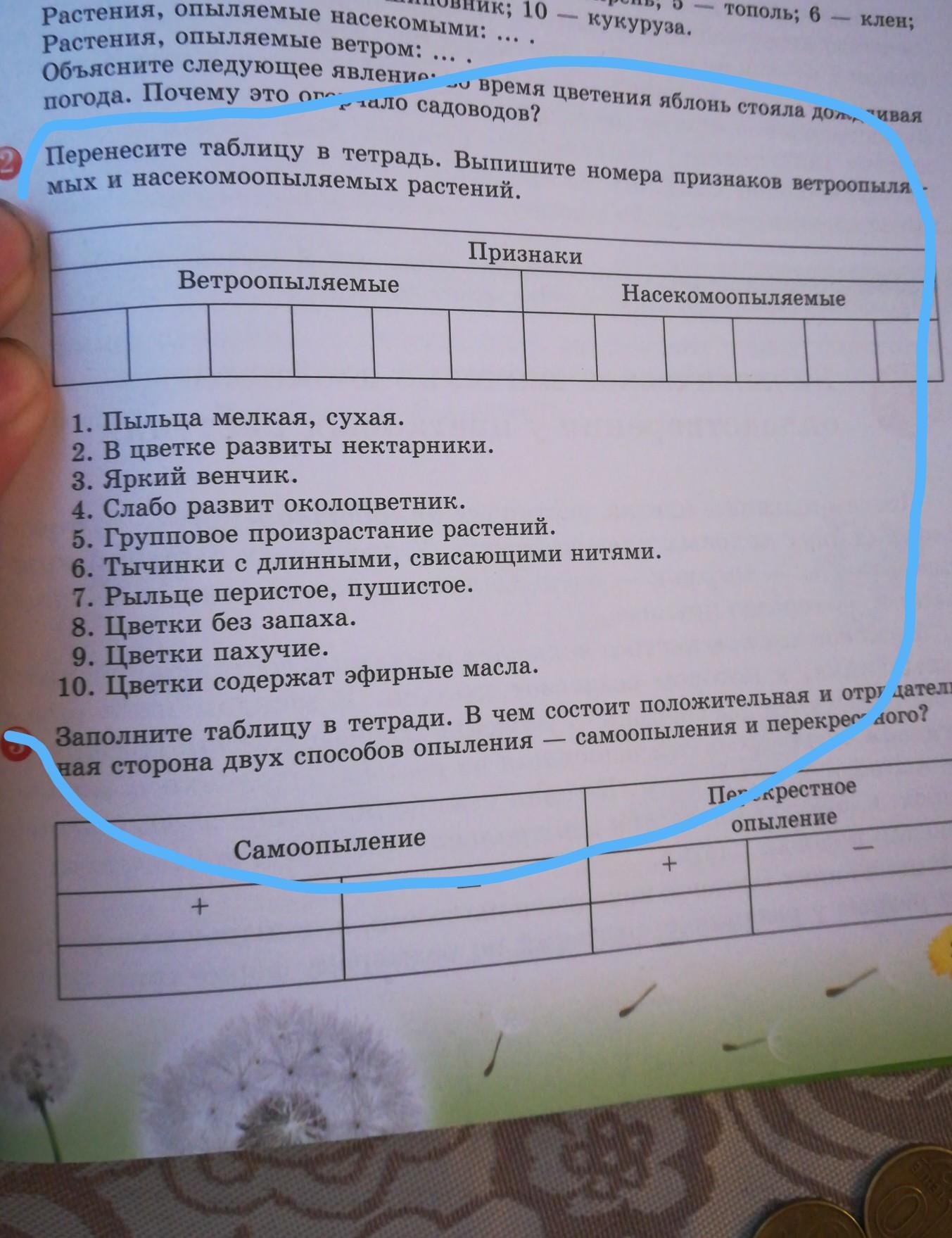 Принесите таблицу в тетрадь. Выпишите номера признаков ветроопыляемых и насекомоопыляемых растений
