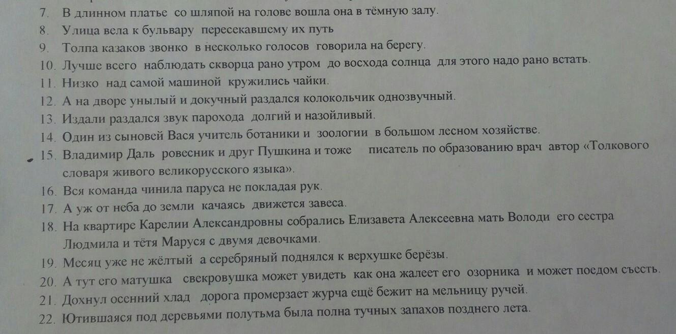 . В длинном платье, со шляпой на голове, вошла она в тёмную залу. 8. Улица вела к бульвару, пересекавшему их путь 9. Толпа казаков звонко, в несколько голосов, говорила на берегу. 10. Лучше всего наблюдать скворца рано утром, до восхода солнца, для этого надо рано встать. 11. Низко, над самой машиной, кружились чайки. 12. А на дворе, унылый и докучный, раздался колокольчик однозвучный. 13. Издали раздался звук парохода, долгий и назойливый. 14. Один из сыновей, Вася, - учитель ботаники и зоологии в большом лесном хозяйстве. 15. Владимир Даль, ровесник и друг Пушкина и тоже писатель, по образованию врач, - автор «Толкового словаря живого великорусского языка». 16. Вся команда чинила паруса не покладая рук. 17. А уж от неба до земли, качаясь, движется завеса. 18. На квартире Карелии Александровны собрались Елизавета Алексеевна, мать Володи, его сестра Людмила и тётя Маруся с двумя девочками. 19. Месяц уже не жёлтый, а серебряный поднялся к верхушке берёзы. 20. А тут его матушка - свекровушка может увидеть, как она жалеет его, озорника, и может поедом съесть. 21. Дохнул осенний хлад – дорога промерзает, журча, ещё бежит на мельницу ручей. 22. Ютившаяся под деревьями полутьма была полна тучных запахов позднего