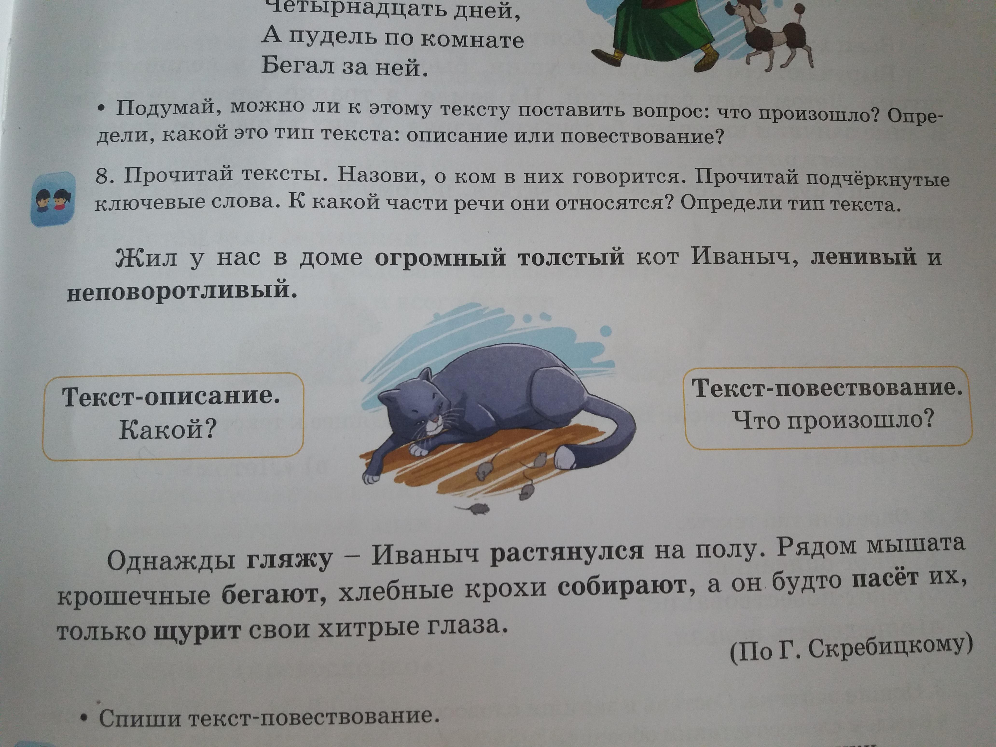 Прочитай текст назови о ком не говорится прочитай подчеркнутые ключевые слова к какой части речи они относятся определите тип текста жил у нас в доме огромный толстый кот иваныч ленивый и неповоротливый