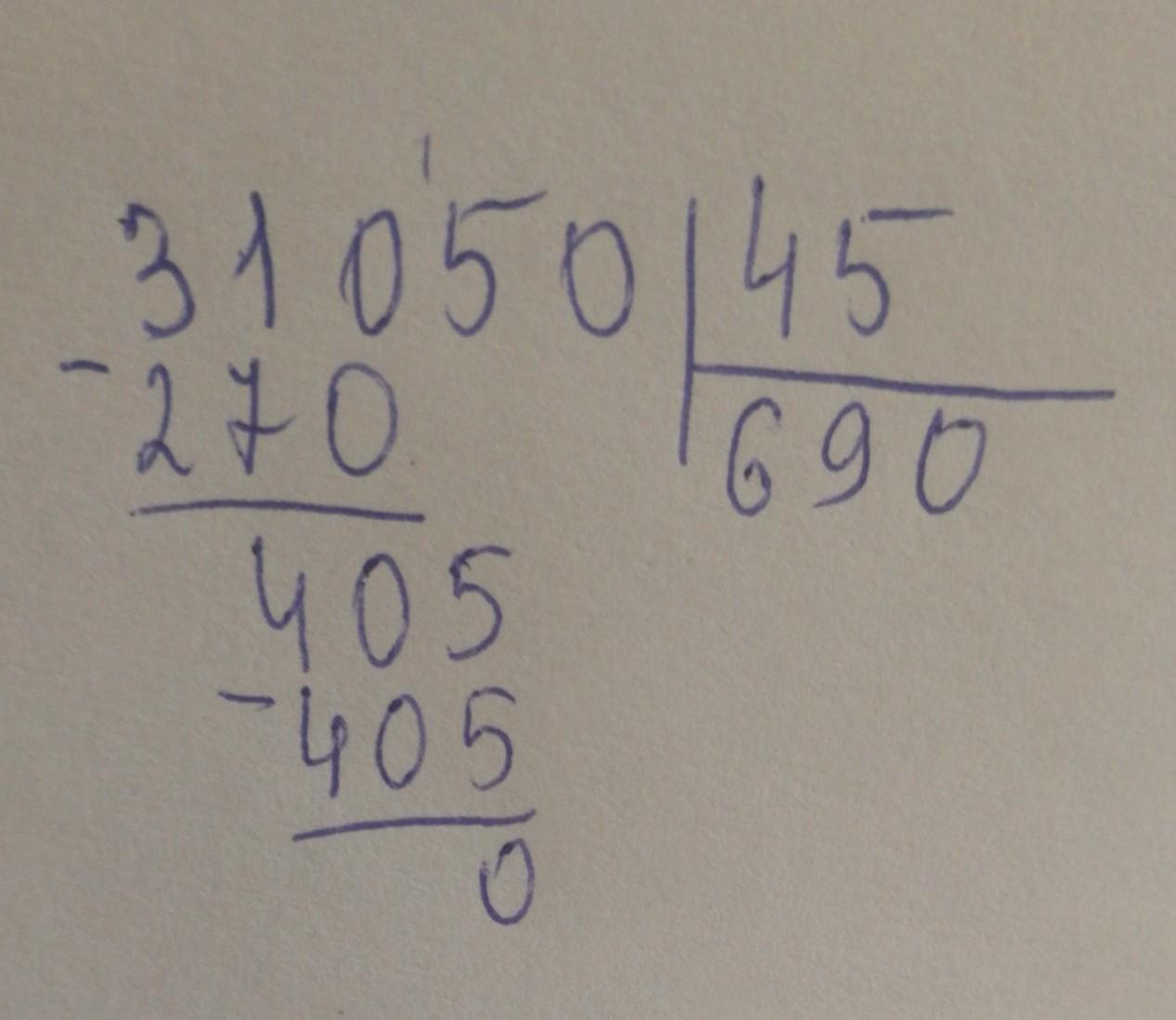 Пошаговое объяснение:первое неполное делимое 310 ,310 в 45 входит 6 раз , 45 •6 = 270, 310-270 =40 остаток , сносим 5, 405 в 45 входит 9 раз , 45•9=405 , потом просто сносим ноль, ровно 690