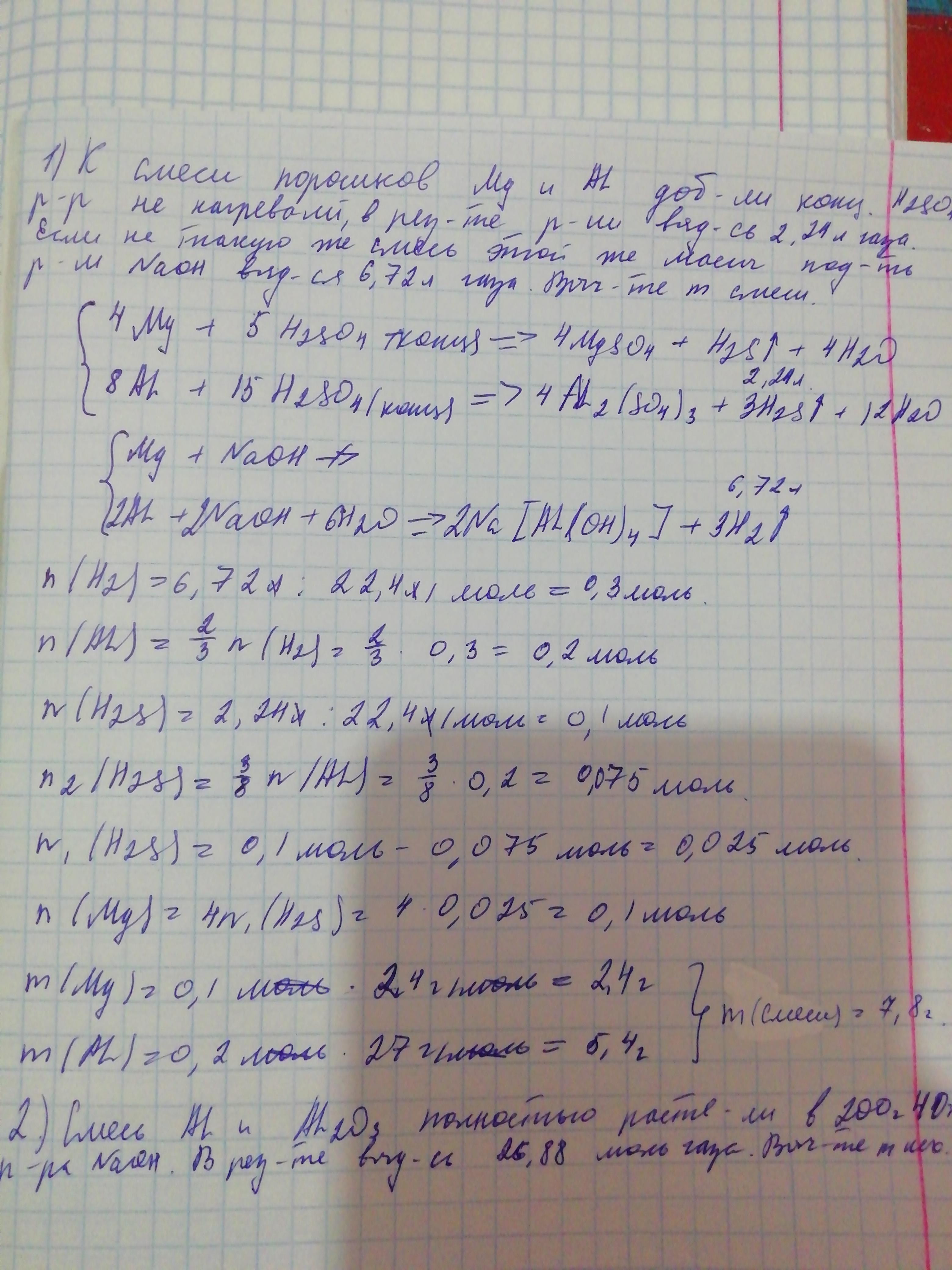 К смеси порошков магния и алюминия добавили концентрированную серную кислоту, раствор не нагревали, в результате реакции выделилось 2,24 л газа. Если на такую же смесь этой же массы подействовать раствором гидроксида натрия выделится 6,72 л газа. Вычислите массу смеси