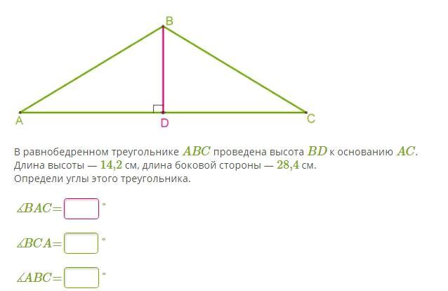 Объяснение:раз гипотенуза в образовавшихся прямоугольных треугольниках в 2 раза больше высоты, то угол напротив которого лежит высота (БЦА)=30 градусам. А дальше по теореме о градусной мере треугольника