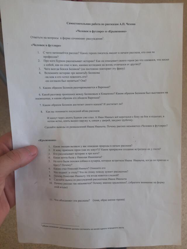 1 Рассказ начинается с описания ночлега двух охотников: Ивана Иваныча Чимша-Гималайского и Буркина. Они остановились в сарае старосты села и рассказывали друг другу разные истории. Разговор зашёл на тему людей «одиноких по натуре, которые, как рак-отшельник или улитка, стараются уйти в свою скорлупу». Буркин рассказывает историю о неком Беликове, недавно умершем в его городке.