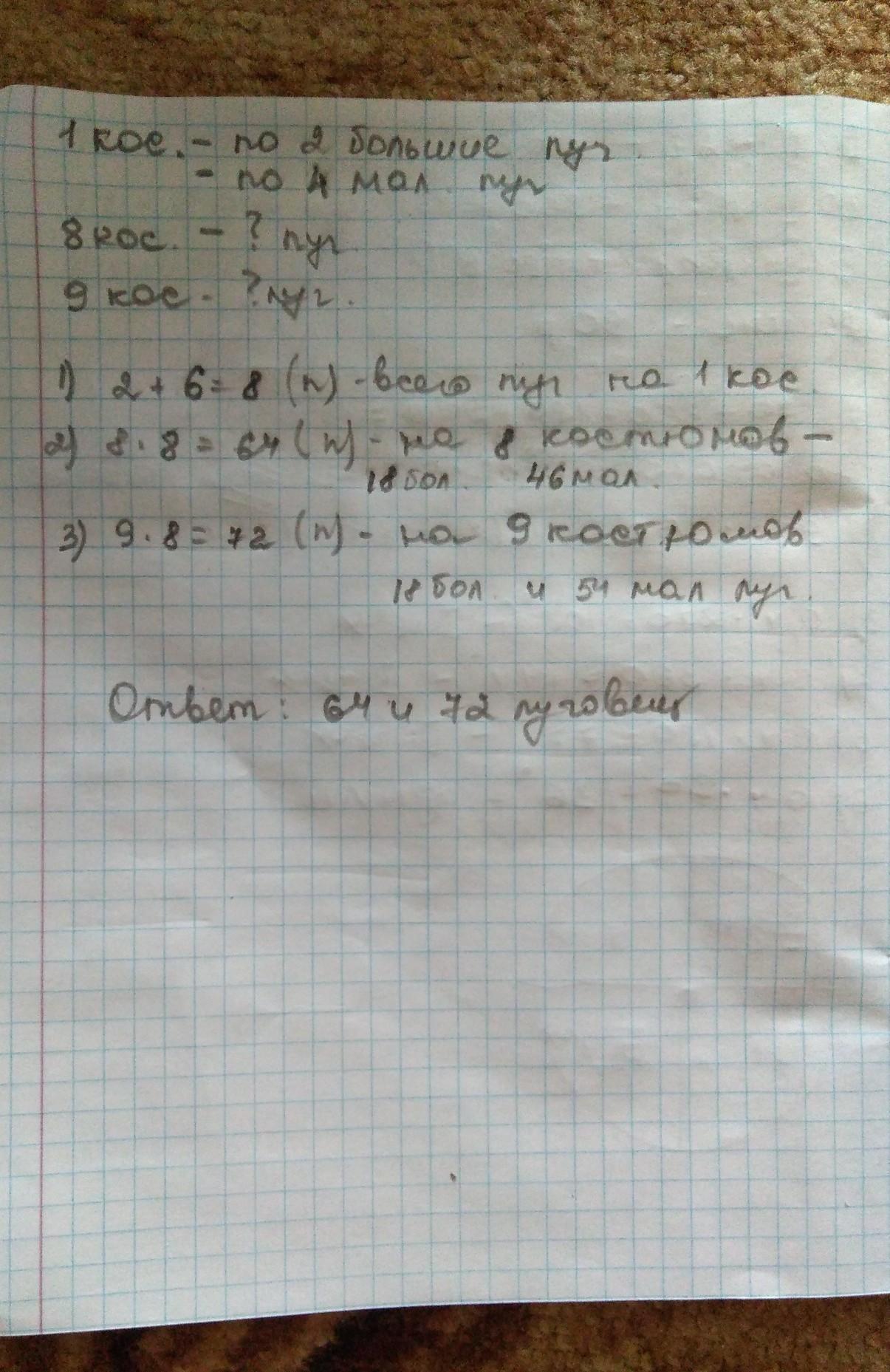 На фабрике к каждому костюму пришивают по 2 большие пуговицы и по 4 маленькие пуговицы .Сколько пуговиц нужно для 8 костюмов ? Для 9 костюмов?