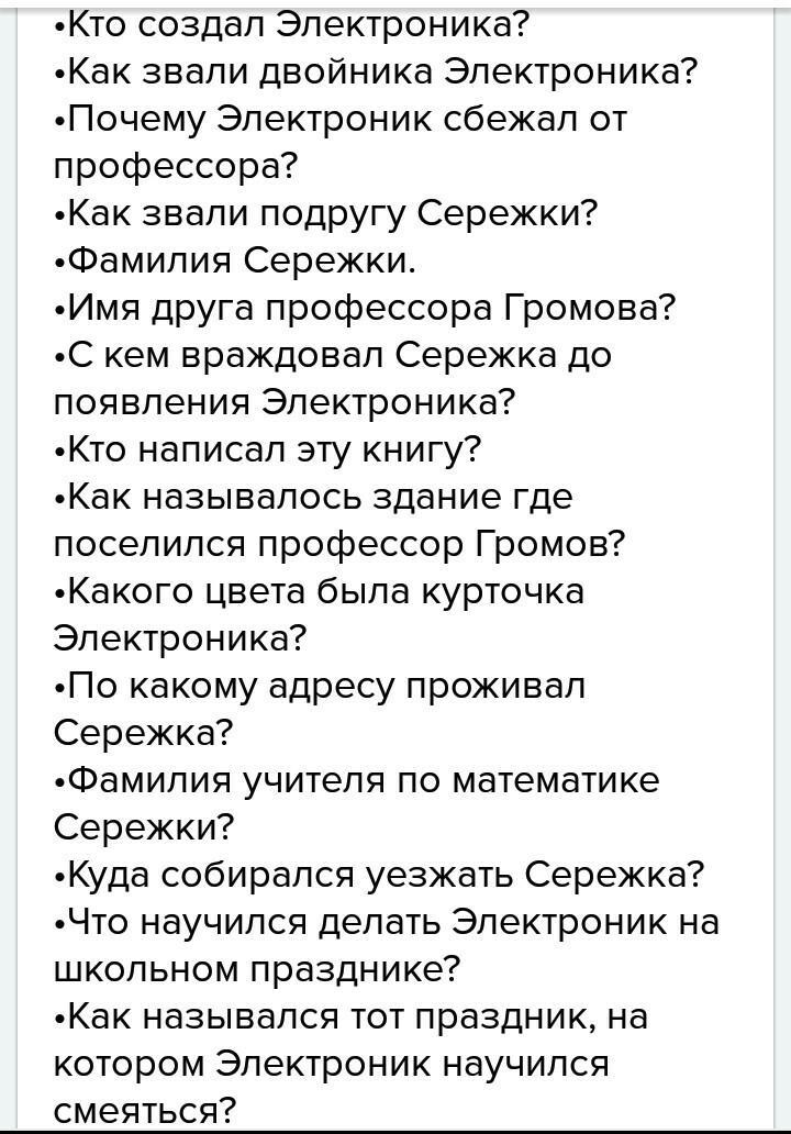 ребят помогите пжжжжжжжжжжжжжжж к произведению "Приключения Электроника" составить 3 вопроса с ответами. дам 10 баллов