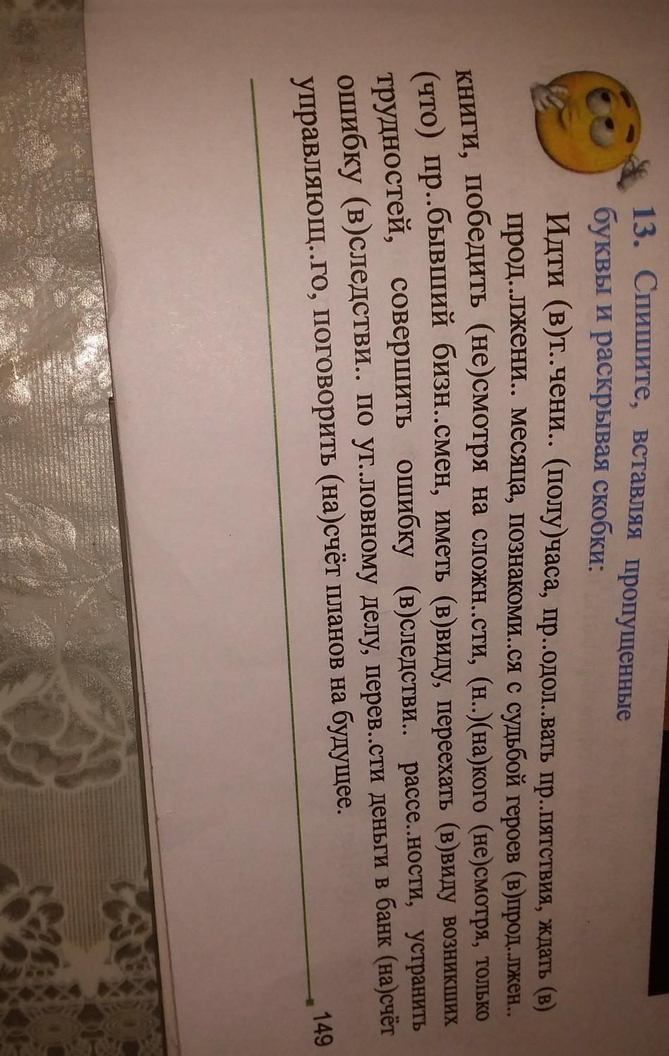 Идти в течение получаса. Преодолевать препятствия. Ждать в продолжение месяца. Познакомиться с судьбой героев в продолжении книги. Победить несмотря на сложности. Ни на кого не смотря. Только что прибывший бизнесмен. Иметь в виду. Переехать ввиду возникших трудностей. совершить ошибку вследствие рассеянности. Устранить ошибку в следствии по уголовному делу. Перевести деньги на банк на счёт управляющего. Поговорить насчёт планов на будущее.