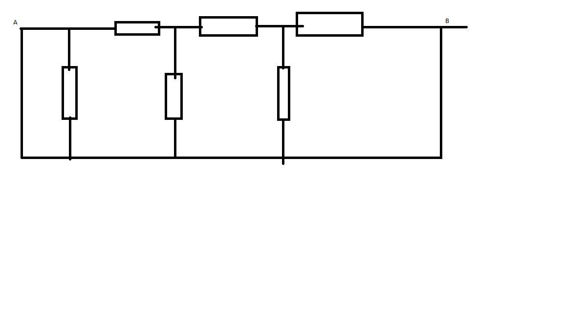 Если схема нарисована правильно, то сопротивление цепи между точками А и В равно нулю, так как две эти точки напрямую соединены через нижнюю часть цепи.