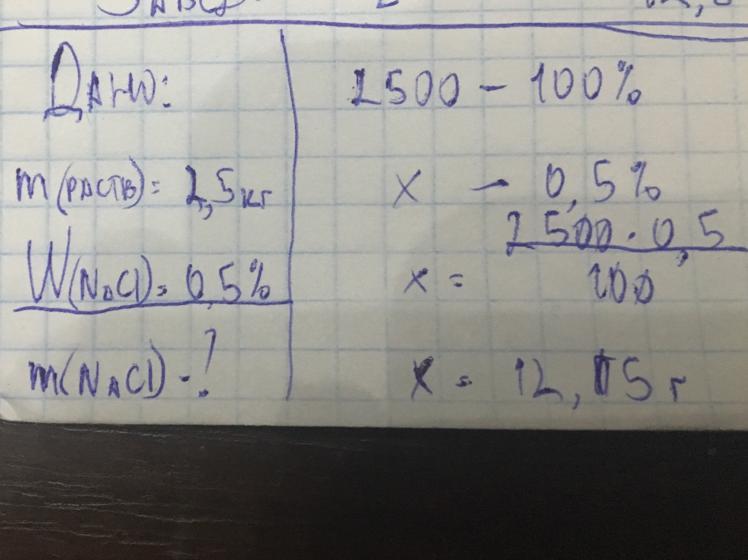 Определите массу вещества в 0,5%-ом растворе соли массой 2,5 кг.