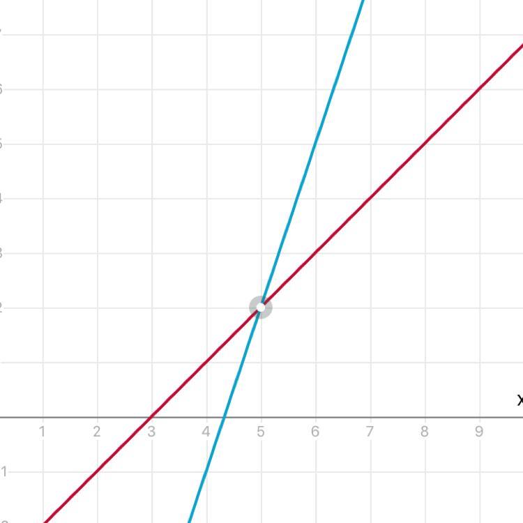 Красная линия - это первое уравнение в заданной системе, а голубая линия - это второе уравнение в системе.