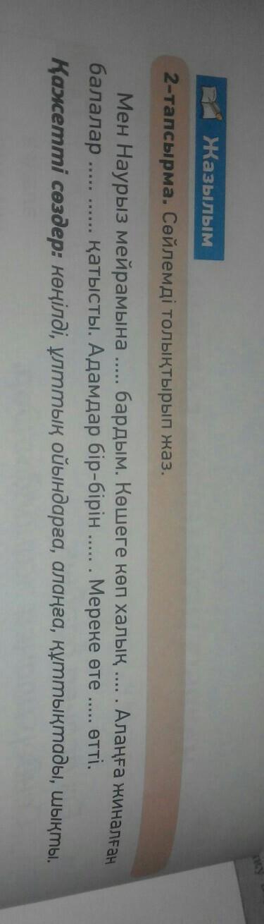 Ответ: 1. алаңға; 2. шықты; 3. ұлттық ойындарға; 4. құттықтады; 5. көңілді