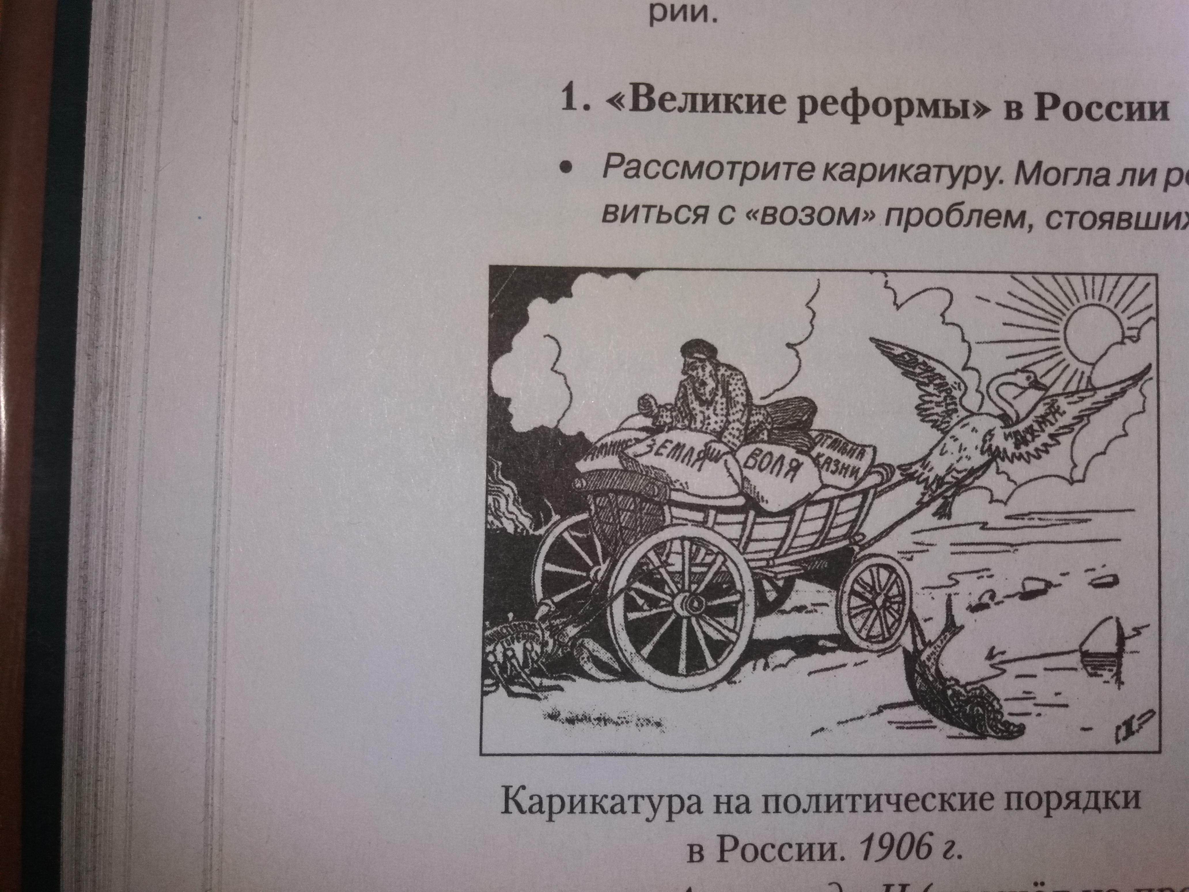 Карикатура датирована 1906 годом, то есть напечатана уже после принятия манифеста 17 октября 1905 года ("Манифест об усовершенствовании государственного порядка"). Скорее всего, уже и первая Дума 1906 года успела показать, насколько неоднородны требования представителей различных партий, представленных в ней, и насколько презрительно царское правительство в принципе относится к Думе. (та самая знаменитая история, когда думцы вносили законопроекты о земле, об отмене смертной казни, об амнистии политических заключённых, а в ответ депутатам предложили решать вопросы о финансировании оранжереи и прачечной).