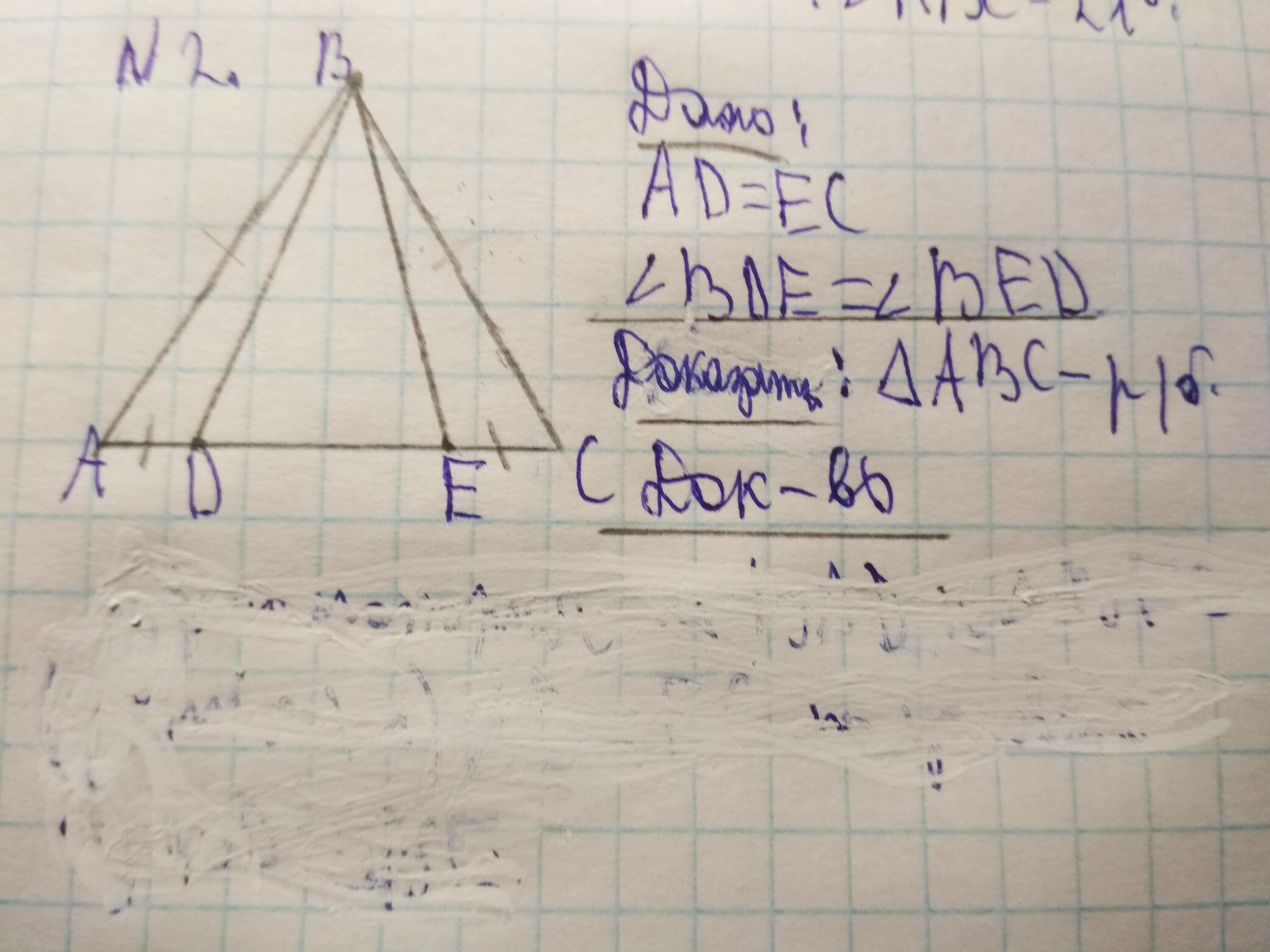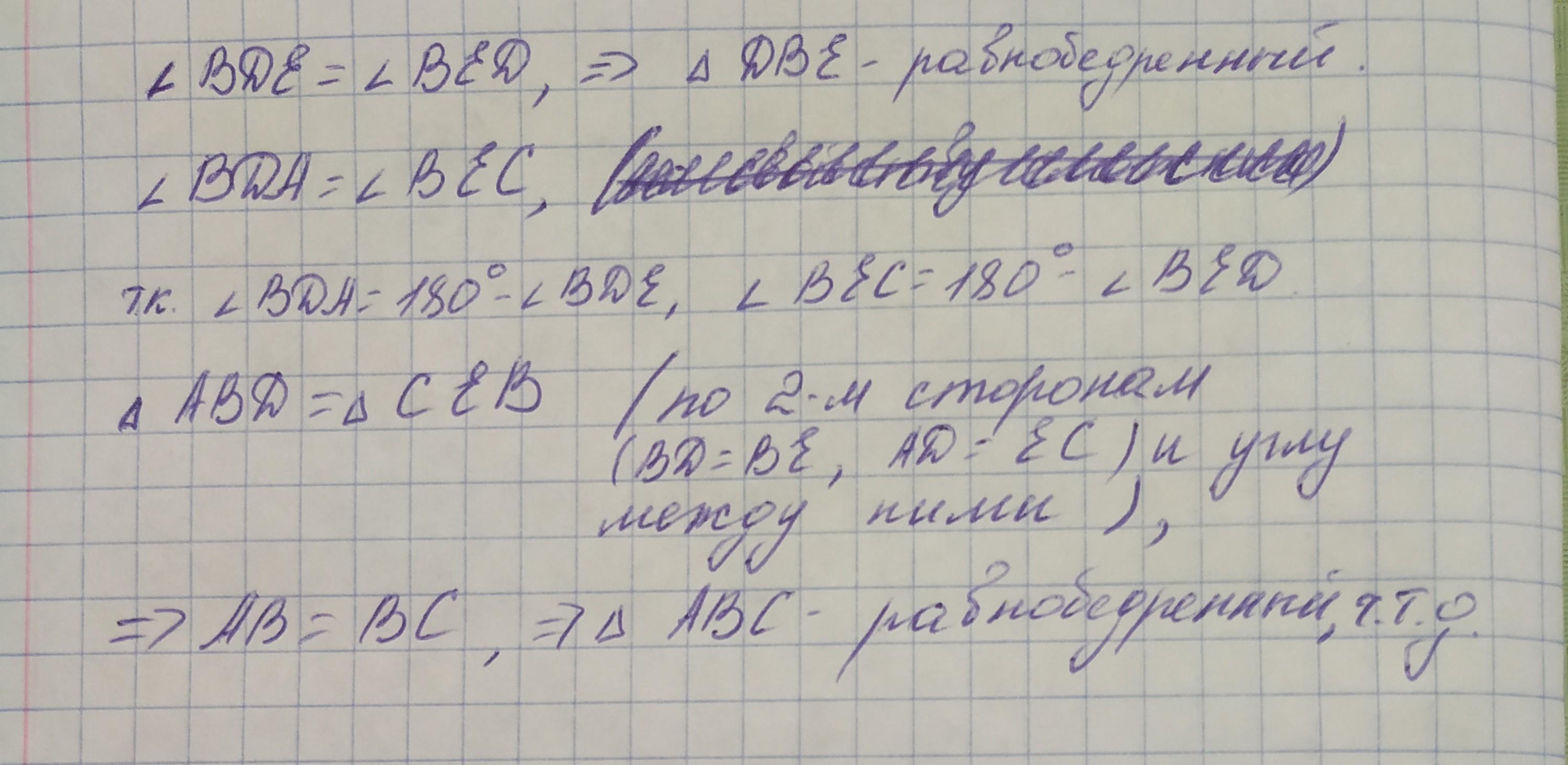 Докажите что треугольник ABC равнобедренный если AD=EC и угол BDE= угол BED
