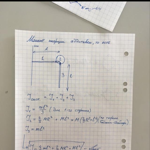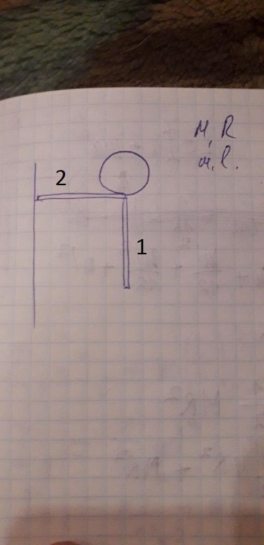 Дано: 2 стержня, каждый массой m и длиной l, и шар массой M и радиусом R. Найти момент инерции системы относительно оси.
