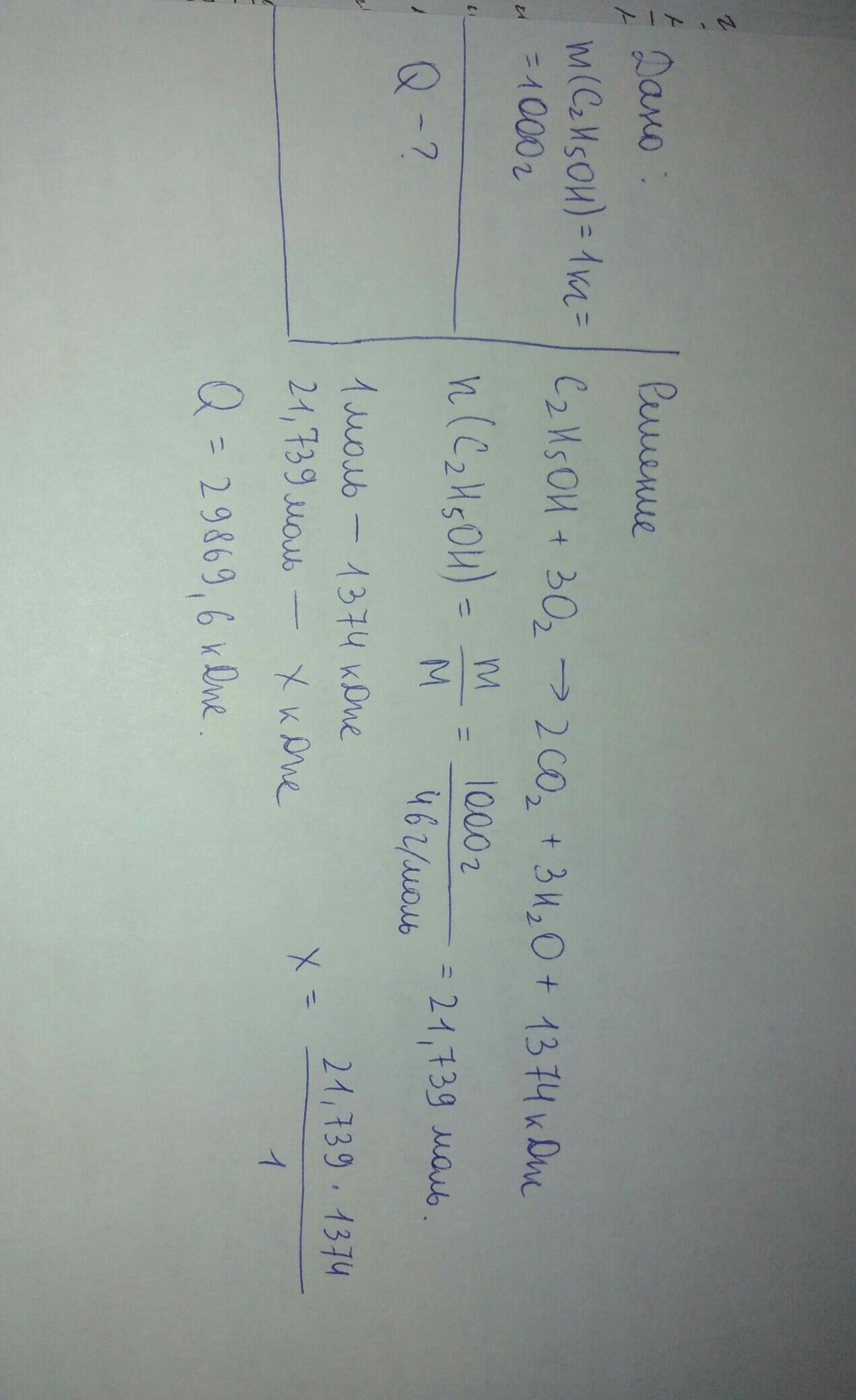 C2H5OH + 3O2 = 2CO2 + 3H2O + 1374 КДж,