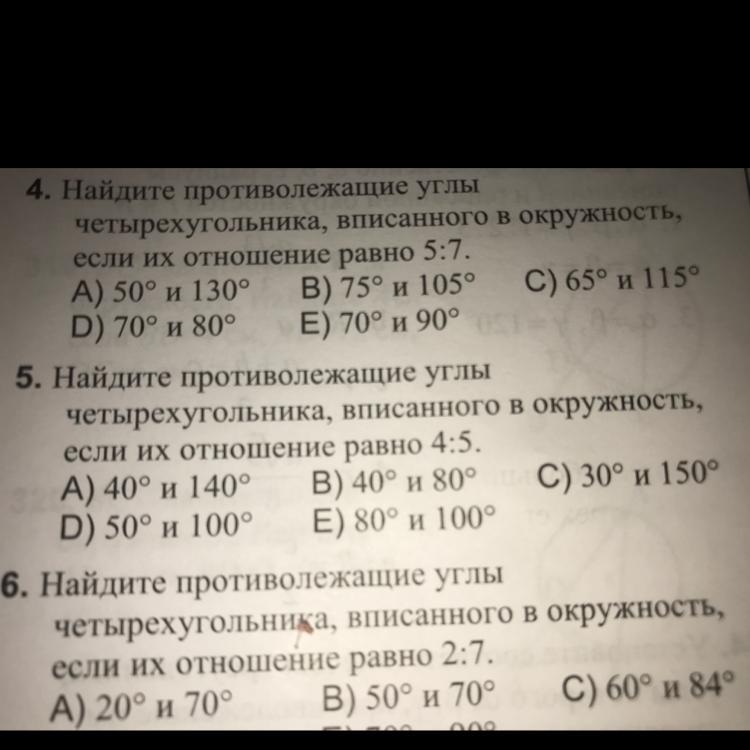 Найдите противолежащие углы четырёхугольника, вписанного в окружность, если их отношение равно 4:5
