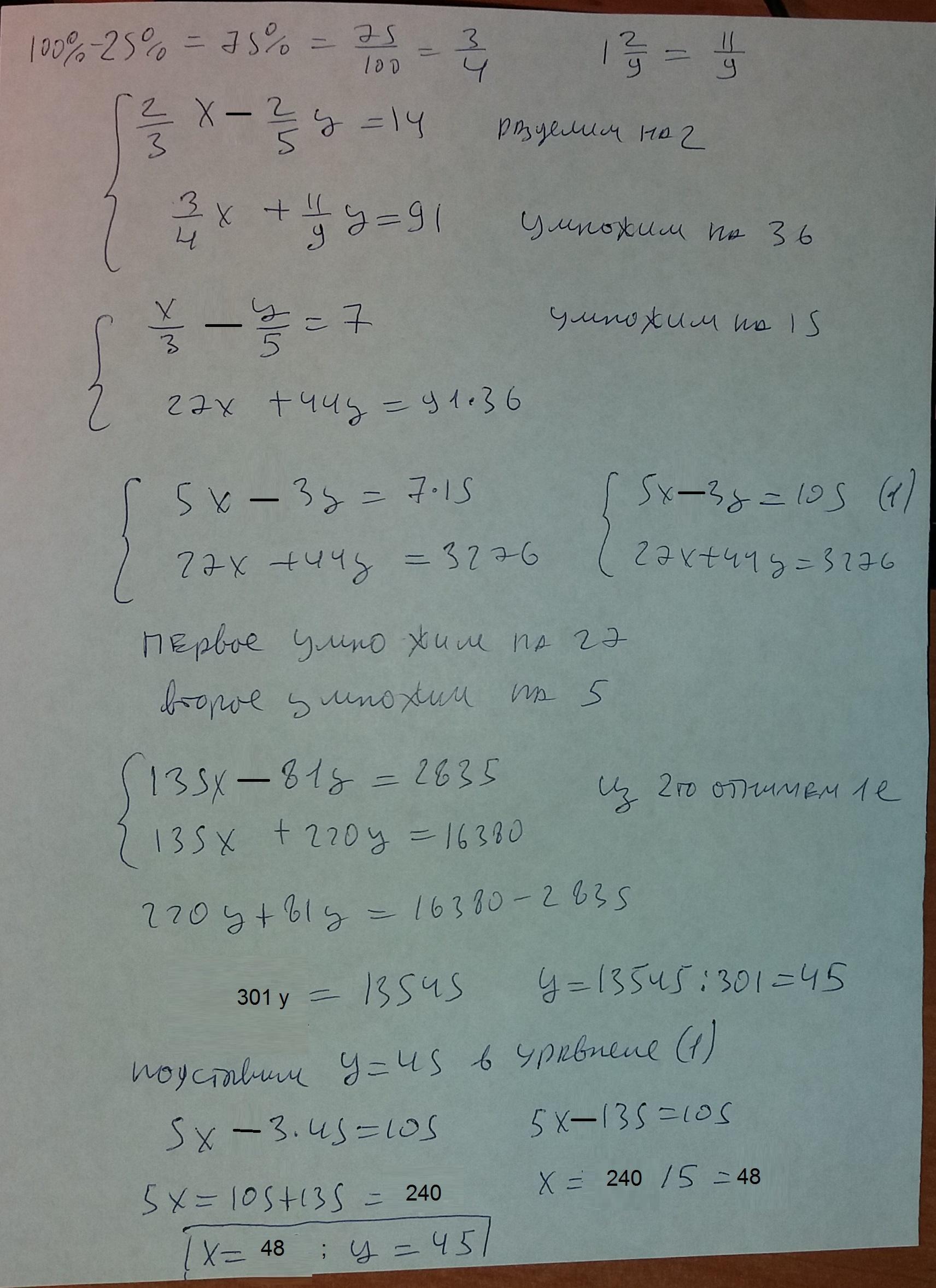 Разность 23 части одного числа с 25 части другого числа равна 14.Если первое число уменьшить на 25%,а второе число увеличить на 29-ю его часть,то сумма этих чисел будет равна 91.Найдите эти числа.Решите пожалуйста системой линейных уравнений.Даю 90 баллов