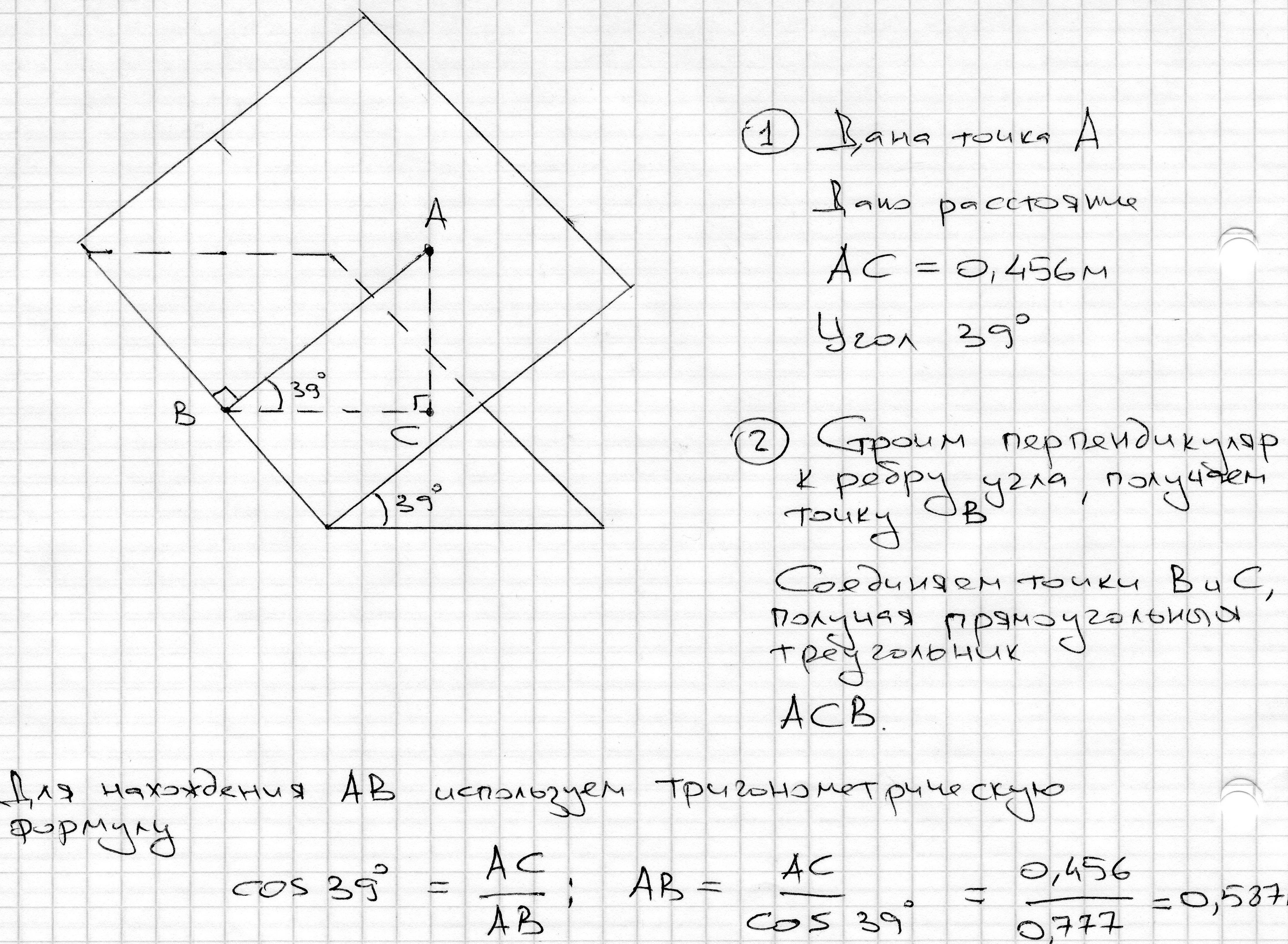 На грани двугранного угла, равного 39 градусов, на расстоянии 0,456 м от другой грани лежит точка А. Найти расстояние от этой точки до ребра данного угла