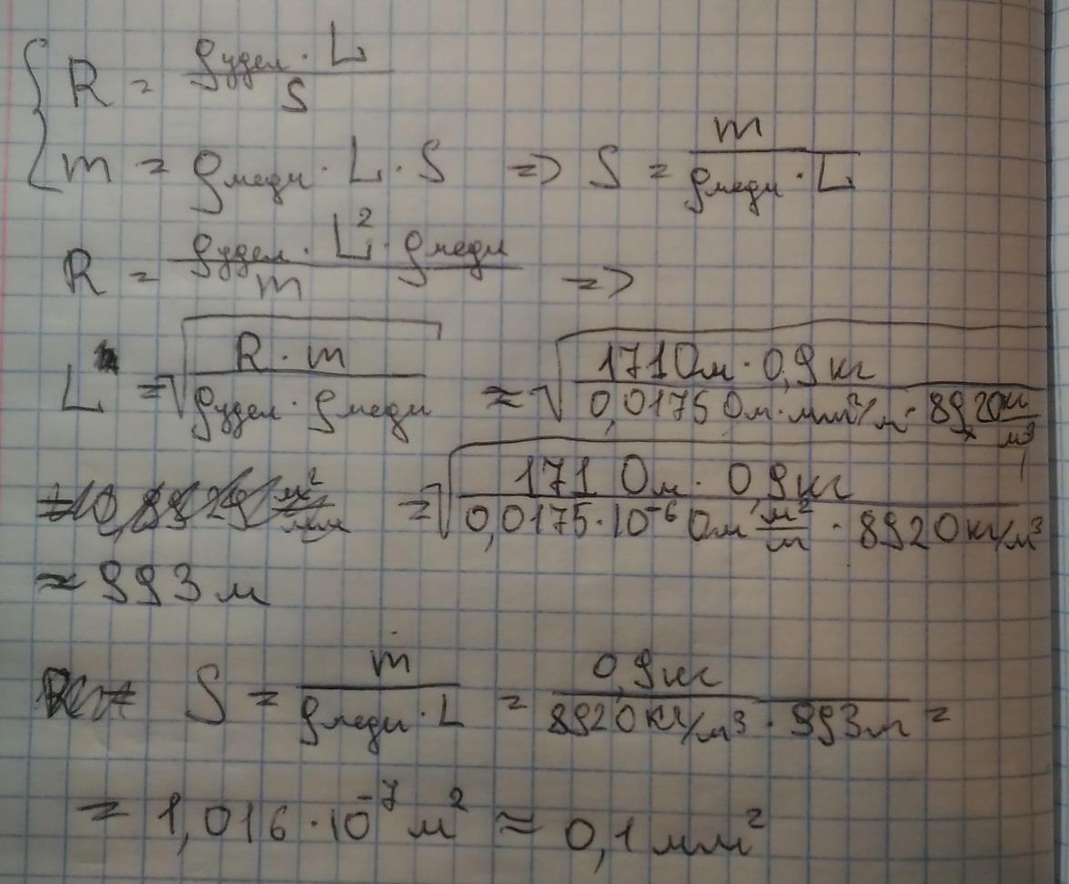 Определить длину медной проволоки L и площадь ее поперечного сечения S. Известна масса медной проволоки m=900 г и электрическое сопротивление R=171 Ом.