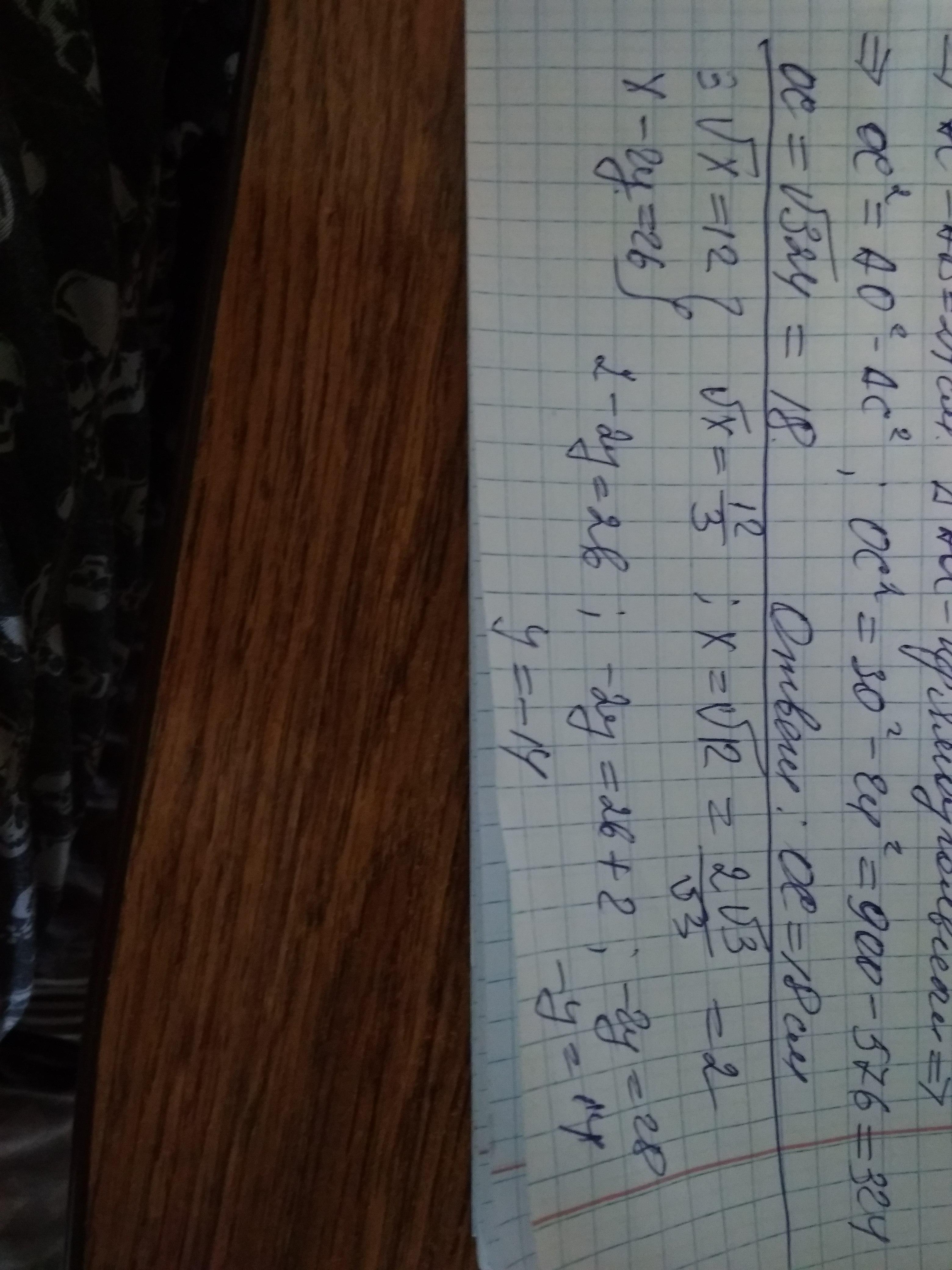 корень из x=12/3; корень из x=4; x=16. подставляем во 2 уравнение: 16-2y=26; -2y=26-16; -2y=10; y=10 /(-2)= -5. Ответ: (16: -5).