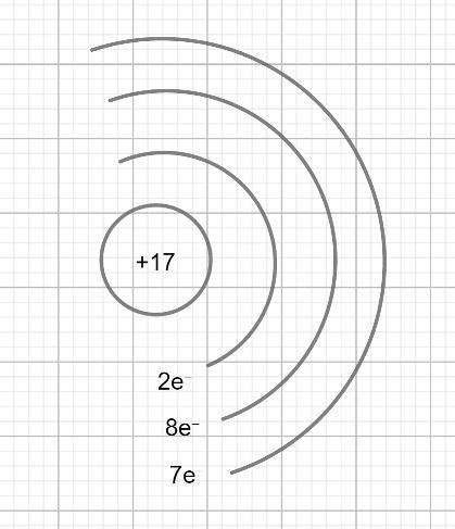 Cl ¹⁷₃₅ заряд ядра = +17, в ядре 17 протонов p⁺, 18 нейтронов n⁰; в атоме хлора 17 электронов e⁻.
