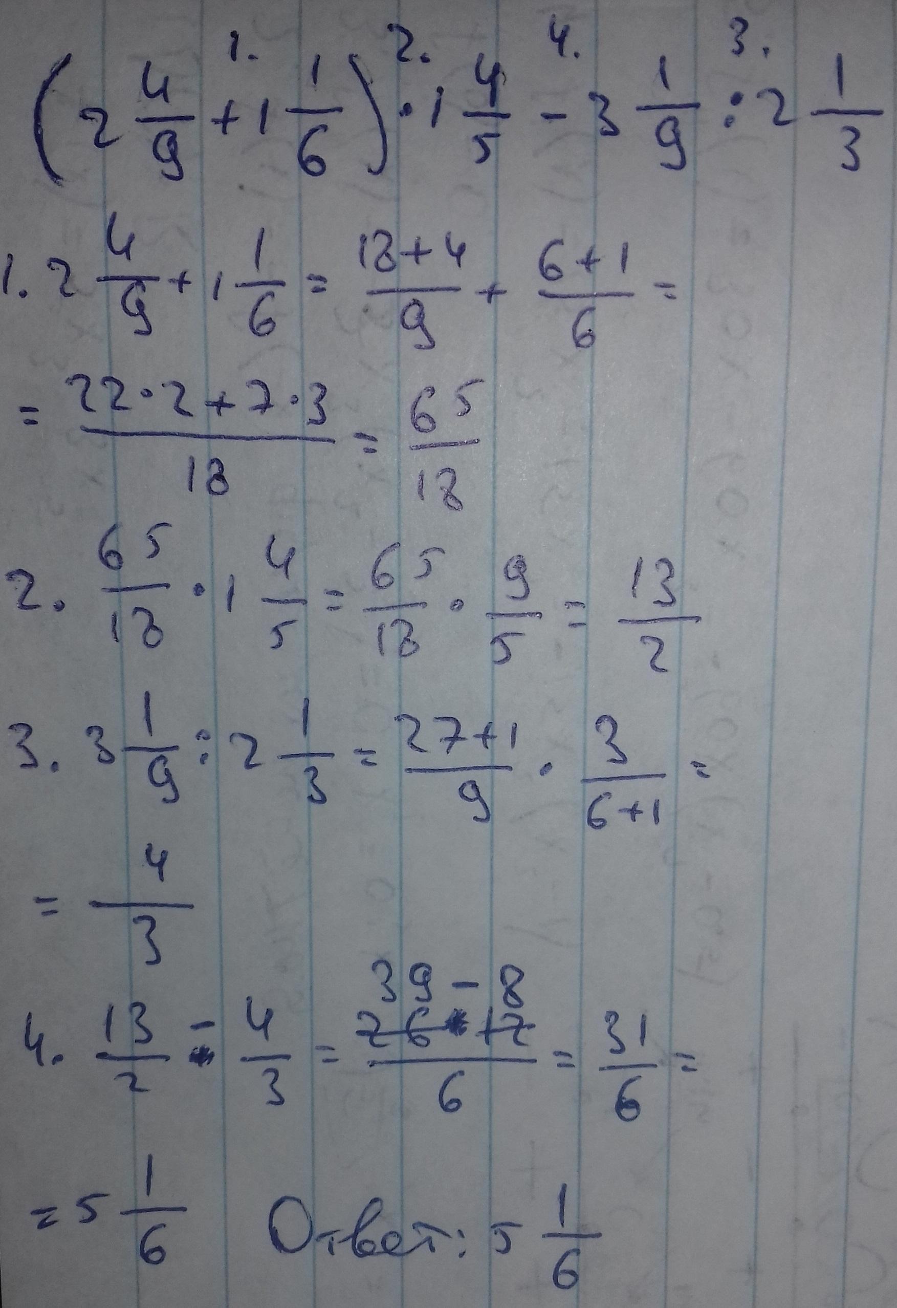 (2 4/9 + 1 1/6) · 1 4/5 - 3 1/9 : 2 1/3 = 5 целых 1/6