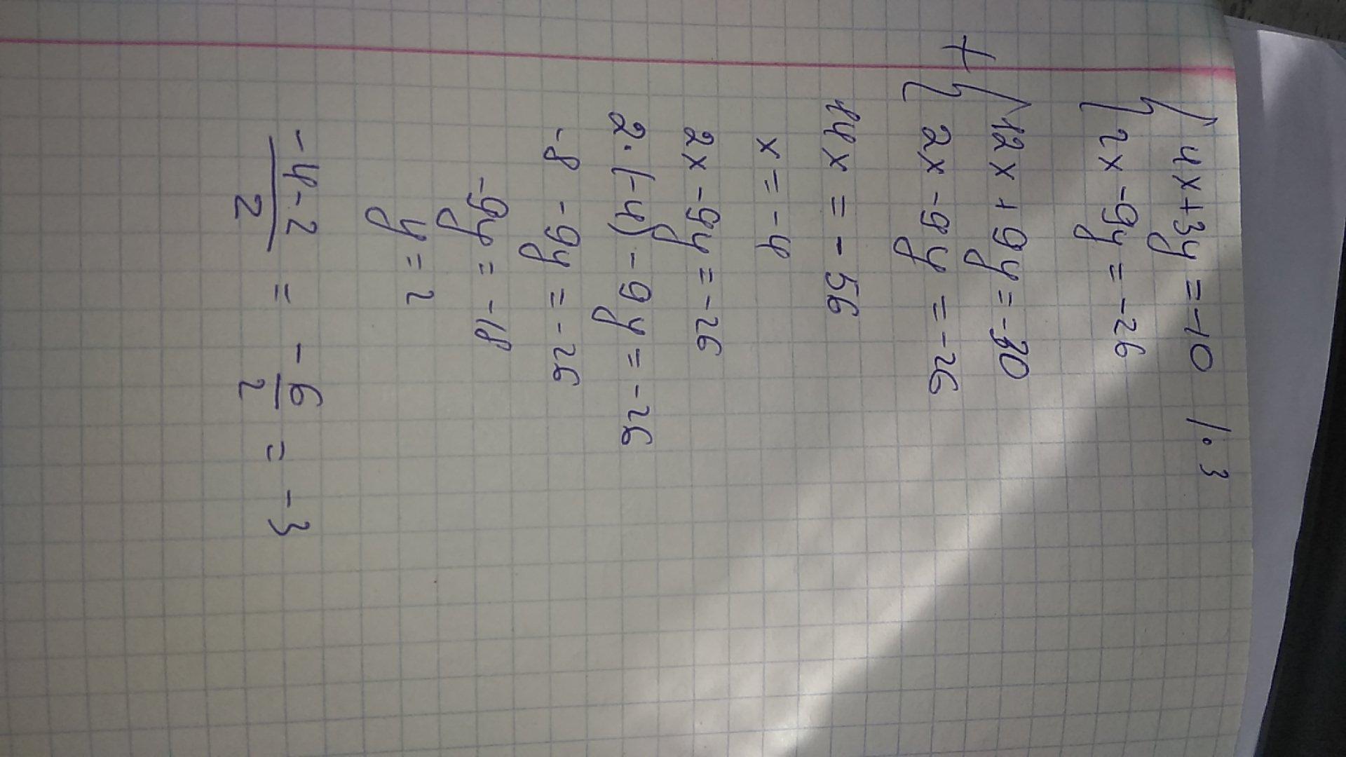 Решите систему уравнений 4x+3y=-10 2x-9y=-26. В ответ значение выражения (x0-y0)/2 Где (x0:y0) являются решением уравнения