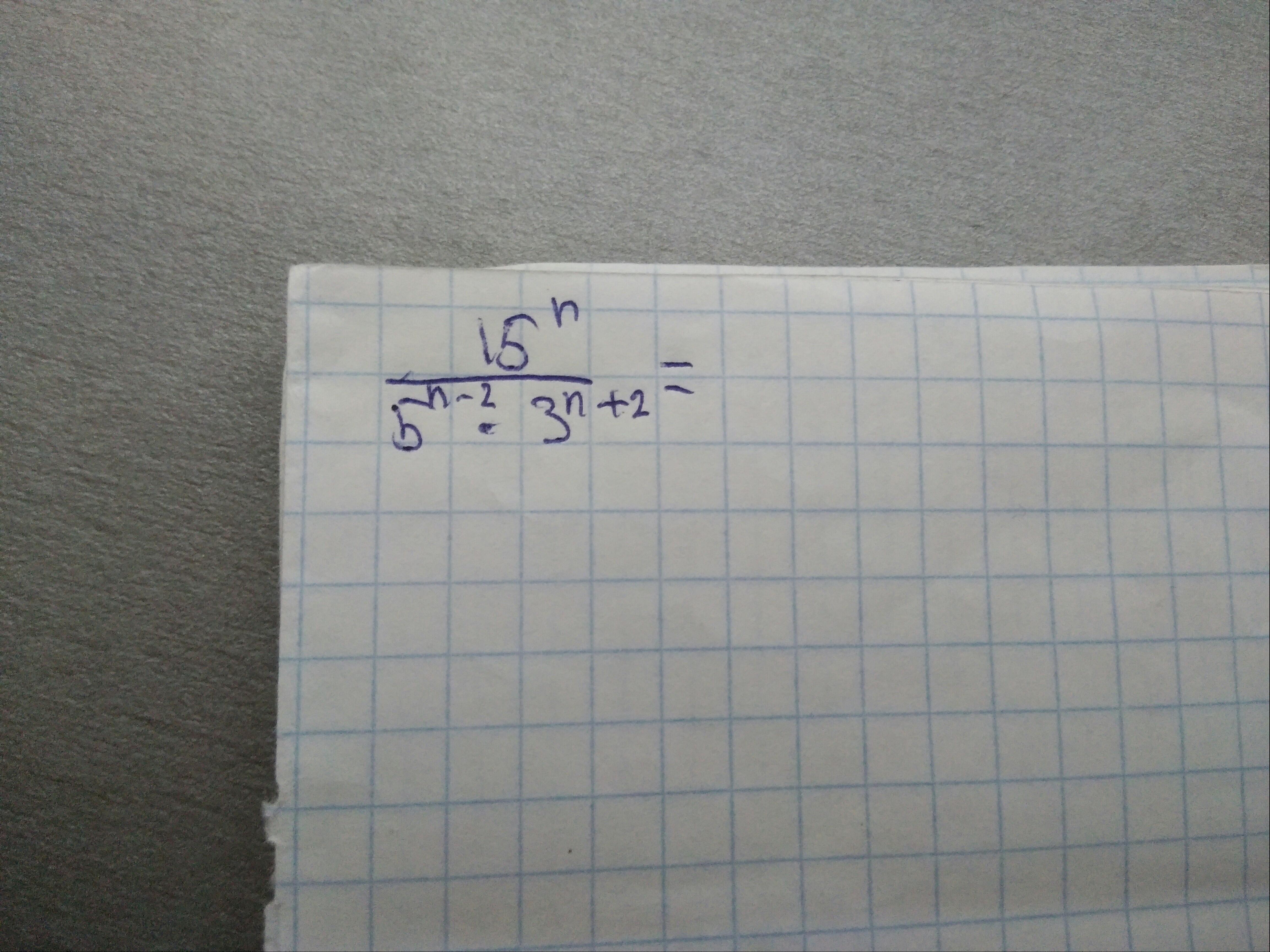 frac{15^{n} }{5^{n-2}*3^{n+2}}= frac{(5*3)^{n} }{5^{n-2}*3^{n+2}}=frac{5^{n}*3^{n}}{5^{n-2}*3^{n+2}}=5^{n-n+2}*3^{n-n-2}=5^{2}* 3^{-2}=frac{25}{9}=2frac{7}{9}