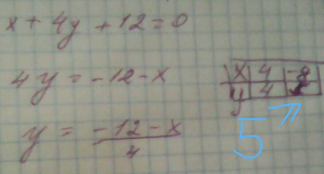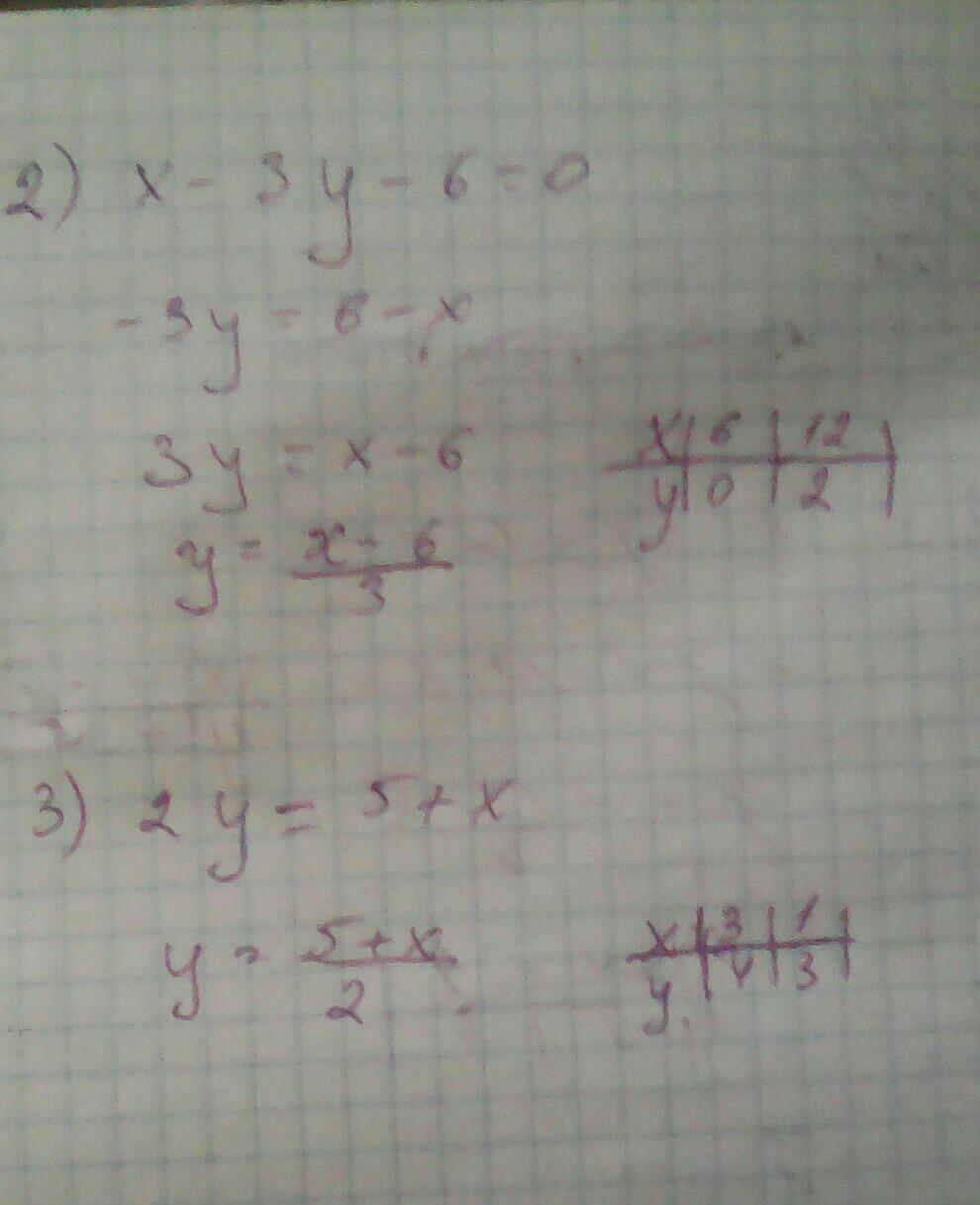 ПОМОГИТЕ ПЛИИЗЗ!!!! Выразив переменную y через переменную x, найдите два каких либо решения уравнения : 1) х+4у+12=0. 2) х-3у-6=0 3)-х+2у-5=0