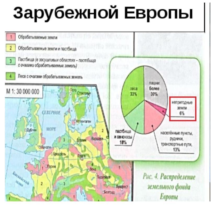 Из-за того,что практически вся Зарубежная Европа лежит в умеренном и субтропическом климате, с достаточной увлажнённостью, у неё высокий агроклиматический потенциал.Поэтому доля неиспользуемых и малоиспользуемых земель составляет всего порядка 6 %.Это территории, расположенные в северных районах с субарктическим климатом.