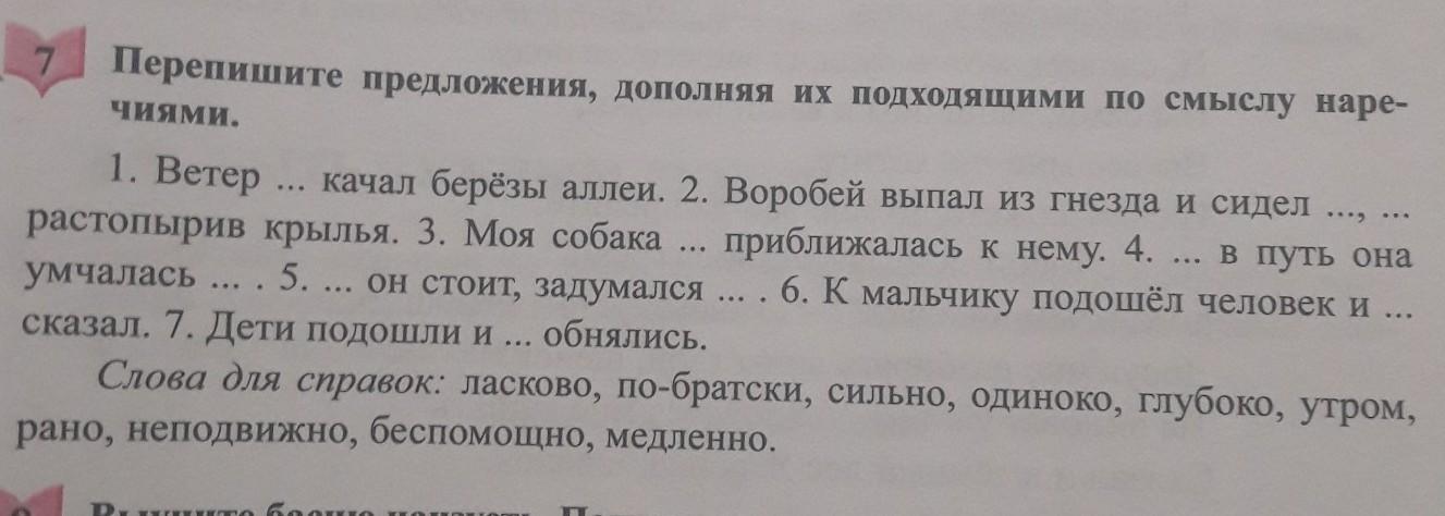 Ветер сильно качал березы аллеиВоробей выпал из гнезда и сидел неподвижно,беспомощно растопырив крылья.Моя собака медленно приближалась к нему.Утром в путь она умчалась рано.Одиноко он стоит,задумался глубоко.К мальчику подошёл человек и ласково сказал.Дети подошли и обнялись по-братски.