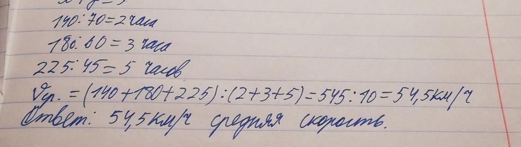 Первые 140 км автомобиль ехал со скоростью 70 км ч следующие 180 км со скоростью 60 км ч а последние 225 км со скоростью 45 км ч Найдите среднюю скорость автомобиля на протяжении всего пути