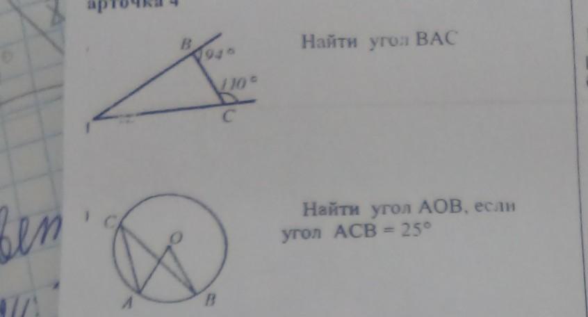 1)угол, смежный с 94 =86, а 110= 86+ВАС 2) вписанный угол =25, а центральный, опирается на ту же дугу, значит он =50