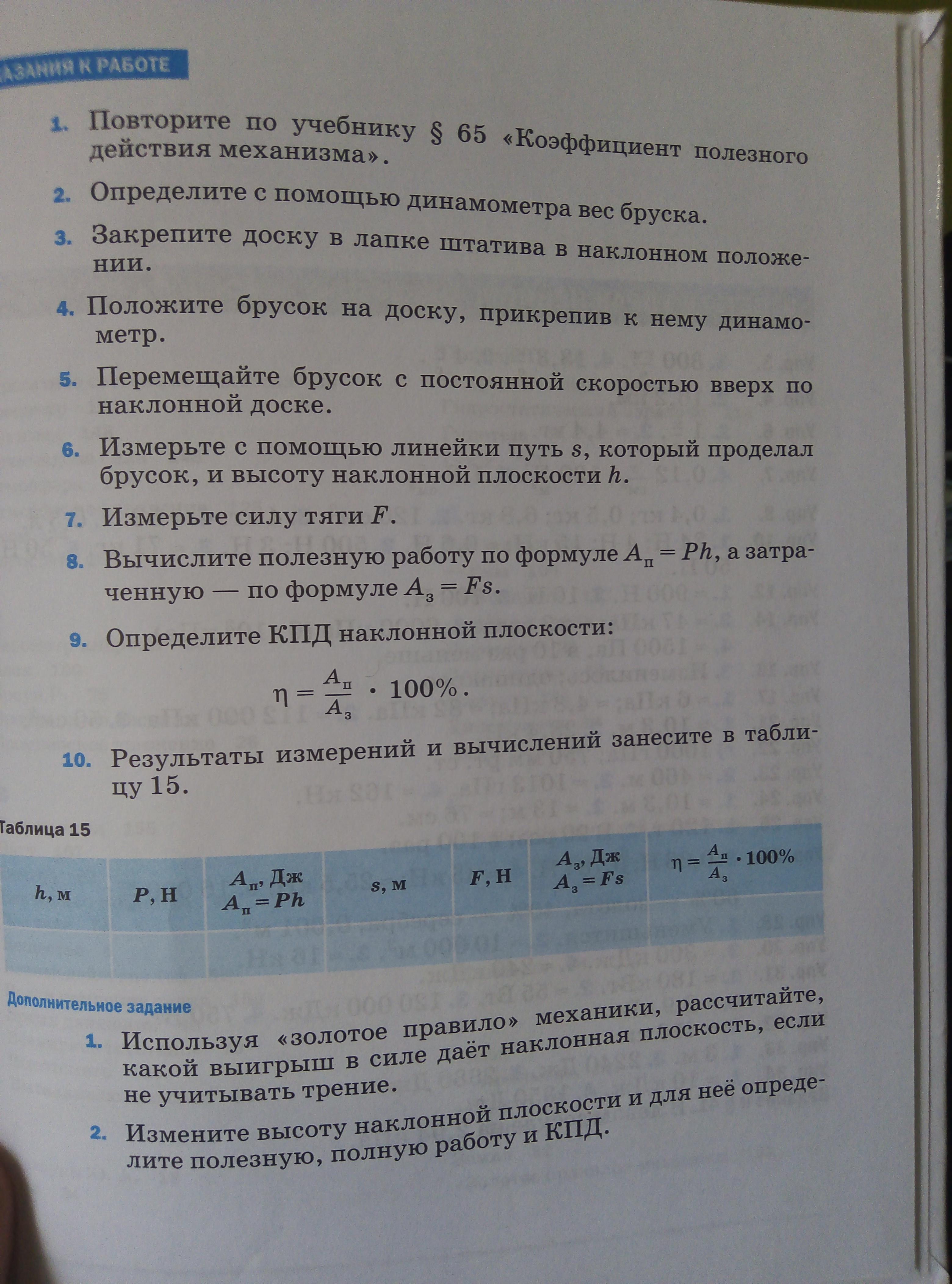 Лабораторная работа по физике 7 класс, вес бруска - 0,6 кг, сила с которой тянется брусок - 0,4H сила тяги, h=14cm, P бруска=0,6, An=p*hi, An=0,6, A3=Fm-S, прошу помогите