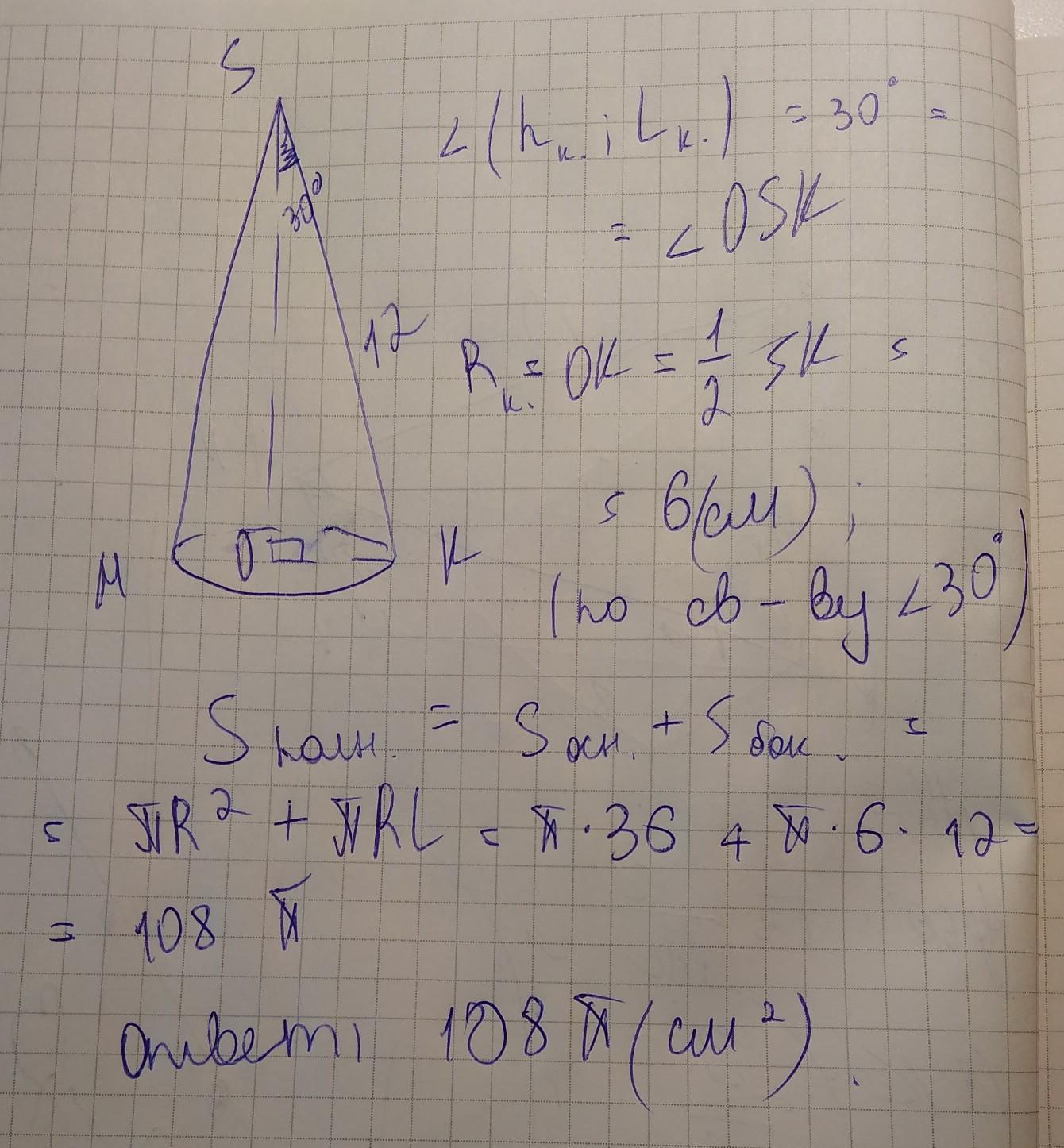 Угол между высотой и образующей конуса равен 30градусов. Вычислите площадь полной поверхности конуса, если образующая равна 12см.