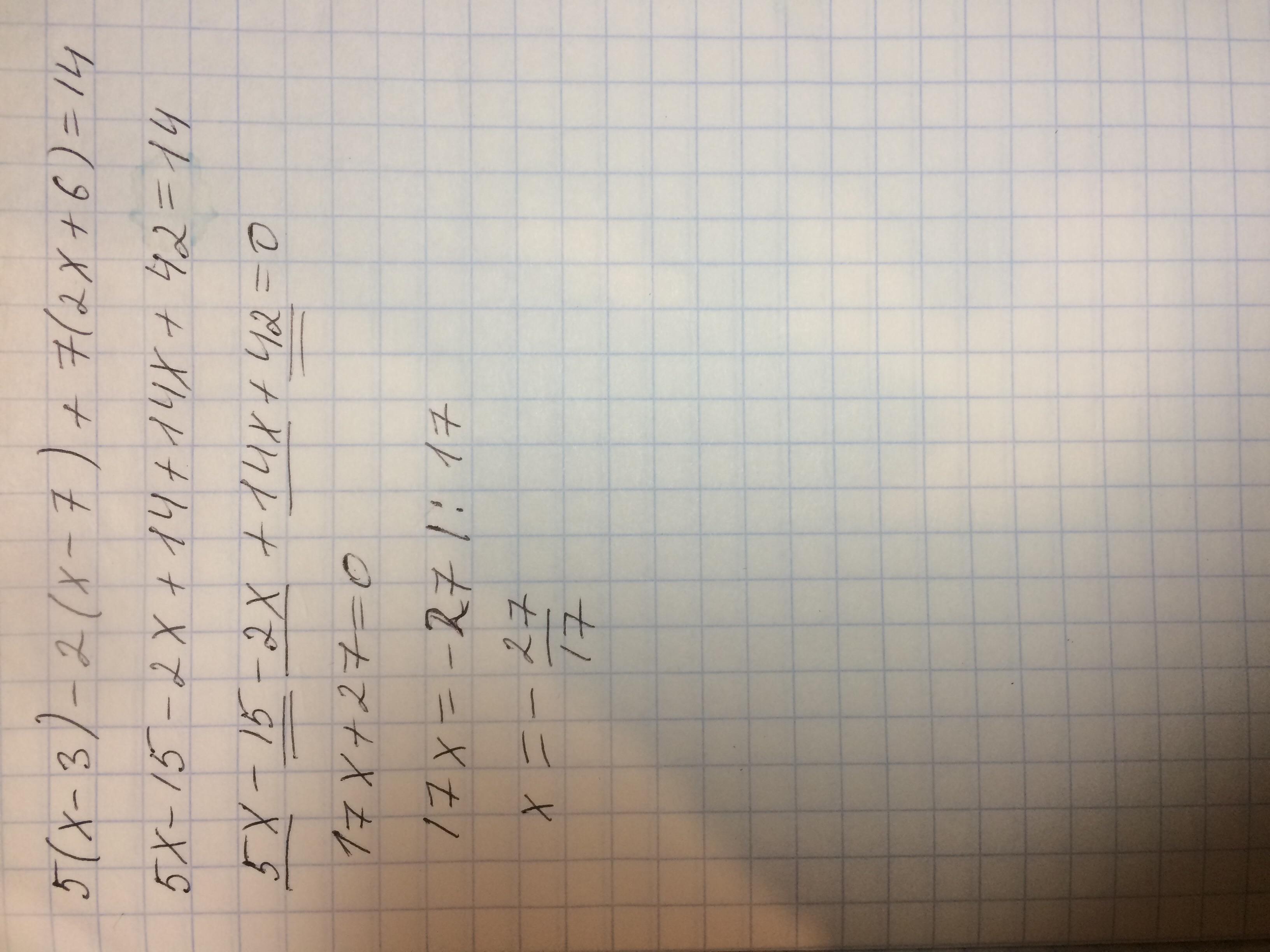 5x-15-2x+14+14x+42=1417x+27=017x=-27X= -27/17X= -1 10/17