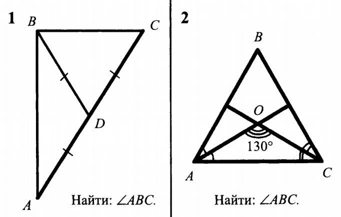 1. Медиана, проведенная из вершины угла В в треугольнике АВС делит противоположную сторону пополам и равна половине этой стороны, тогда угол АВС равен 90° .