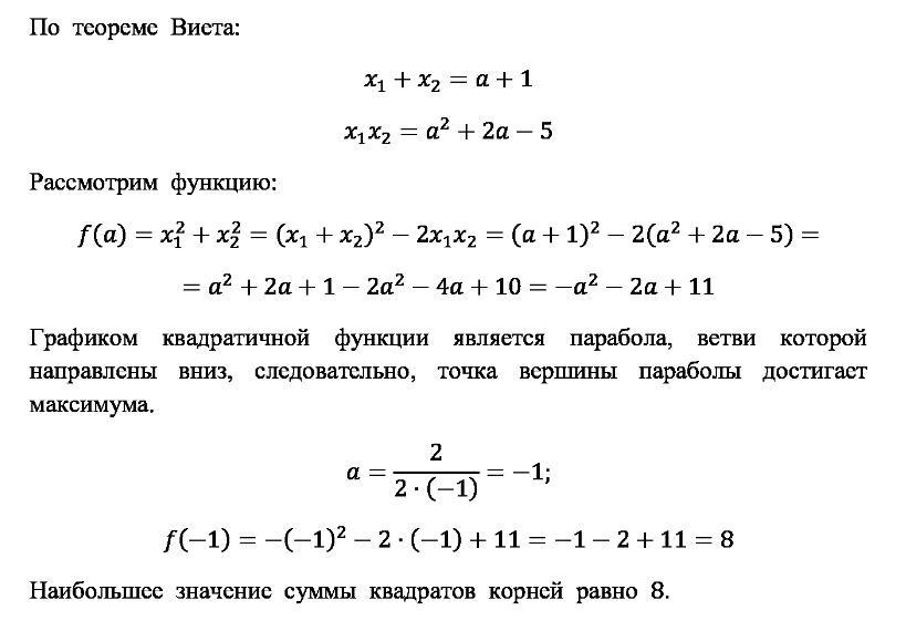 Какое наибольшее значение может принимать сумма квадратов корней трехчлена x^2+(a+1)x+a^2+2a-5 = 0