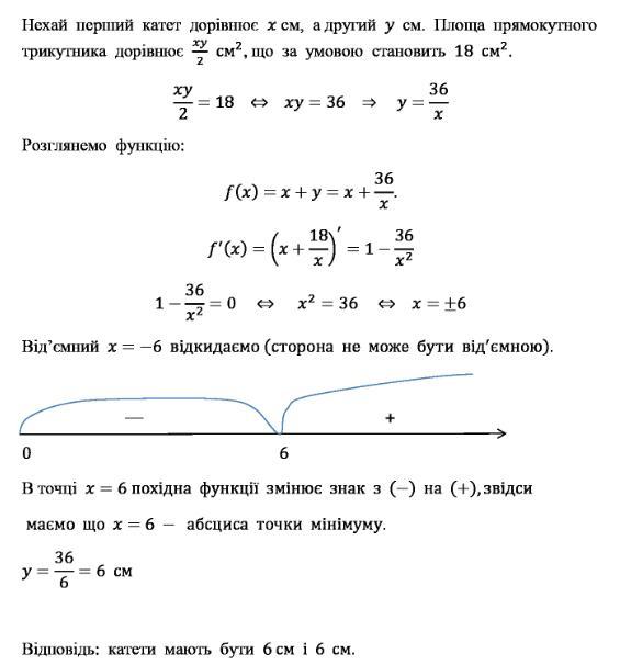 Площа прямокутного трикутника дорівнює 18 см². Якої довжини мають бути його катети, щоб їх сума була найменшою.