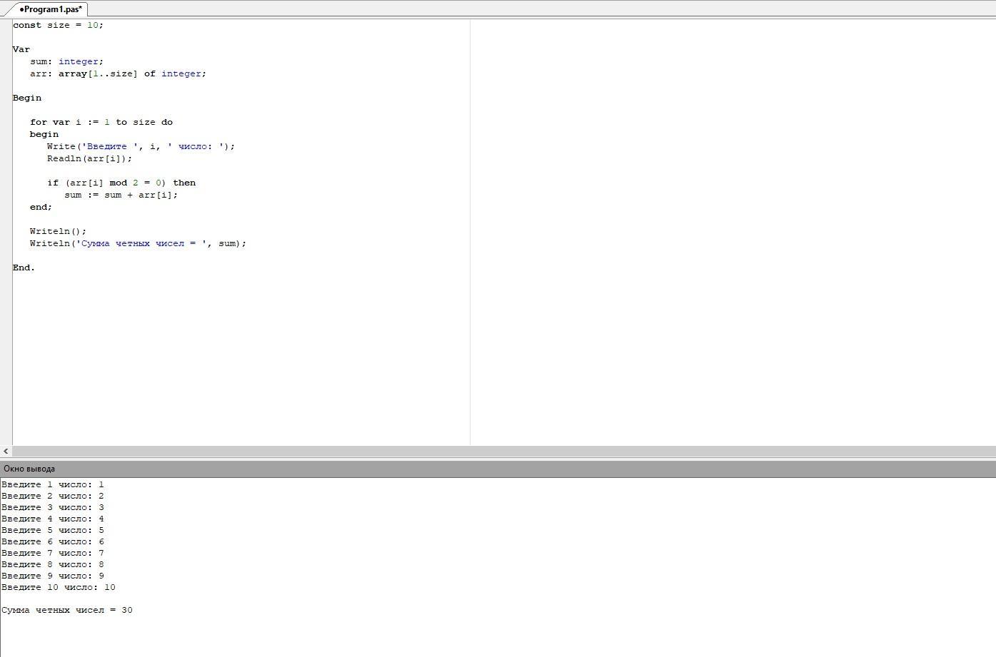 даны 10 чисел, которые последовательно вводятся одно за другим. требуется вычислить сумму только четных чисел. Помогите пожалуйста. Написать программу в Паскале