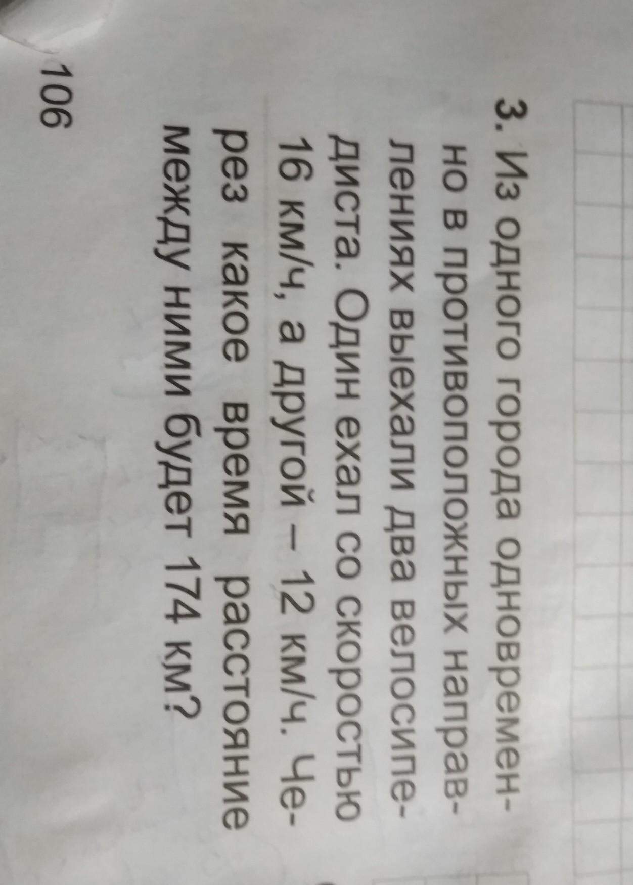 Ответ: расстояние между велосипедистами увеличивается со скоростью 12+16=28 км/час. Расстояние в 174 км наступит через 174/28=6,214 часа.