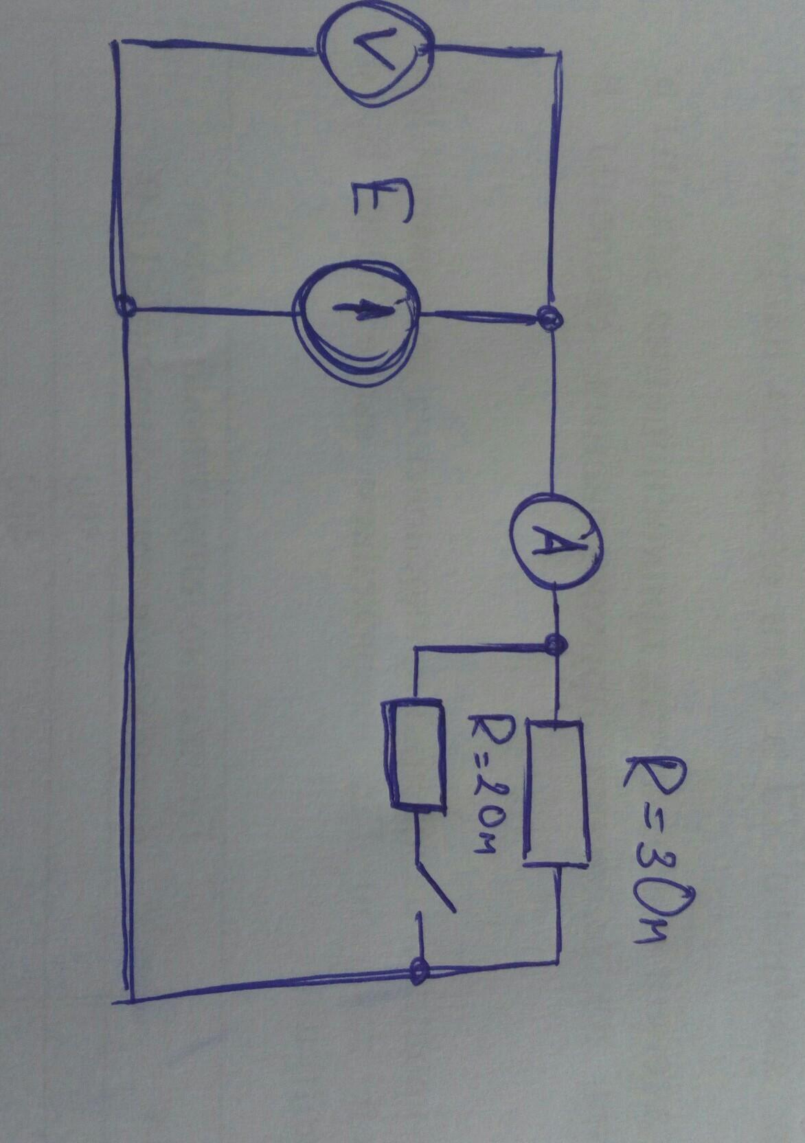 На рисунке приведена фотография электрической цепи. Начертите принципиальную схему этой цепи. Опираясь на законы постоянного тока, объясните, как должны изменяться (уменьшаться или увеличиваться) показания амперметра и вольтметра при размыкании ключа.