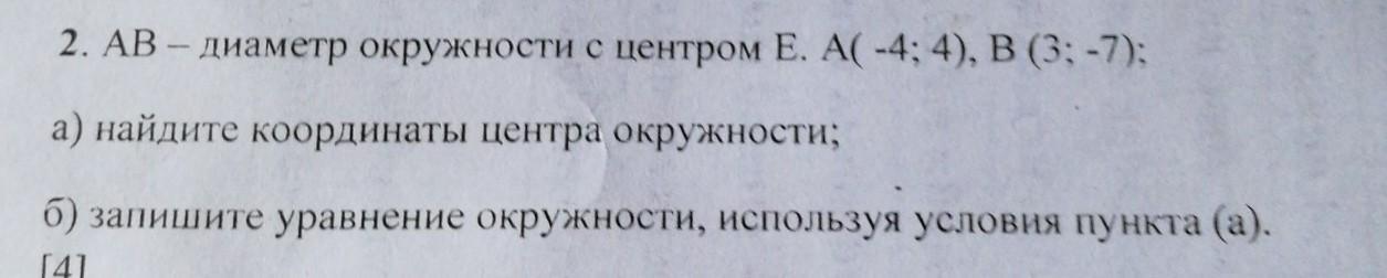 AB – диаметр окружности с центром Е. А(-4; 4), В (3; -7);
