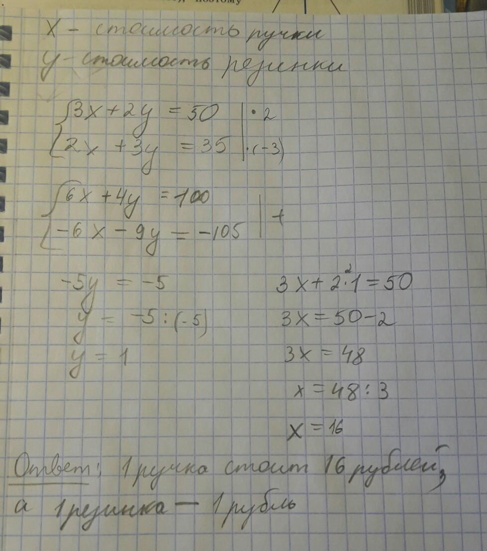 за 3 ручки и 2 резинки стоят 50 рублей два ручки и три резинки стоят 35 рублей.Сколько стоит 1 ручка 1 карандаш?
