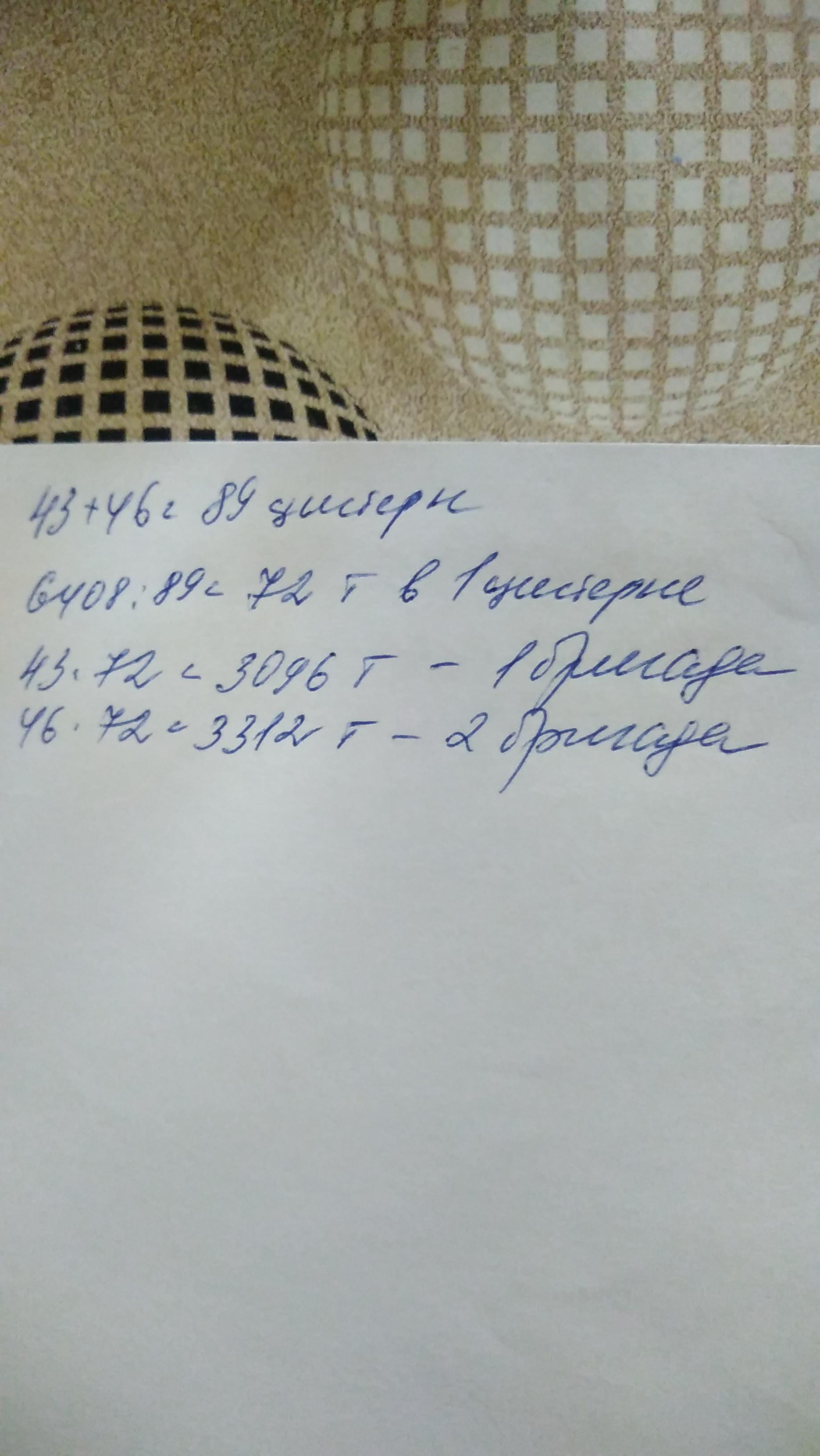 Две бригады нефтяников добыли 6408т нефти.Нефть, добытую первой бригадой погрузили в 43 цистерны а нефть добытую второй бригадой в 46 таких же цистерн . Сколько тонн нефти добыла каждая бригада.