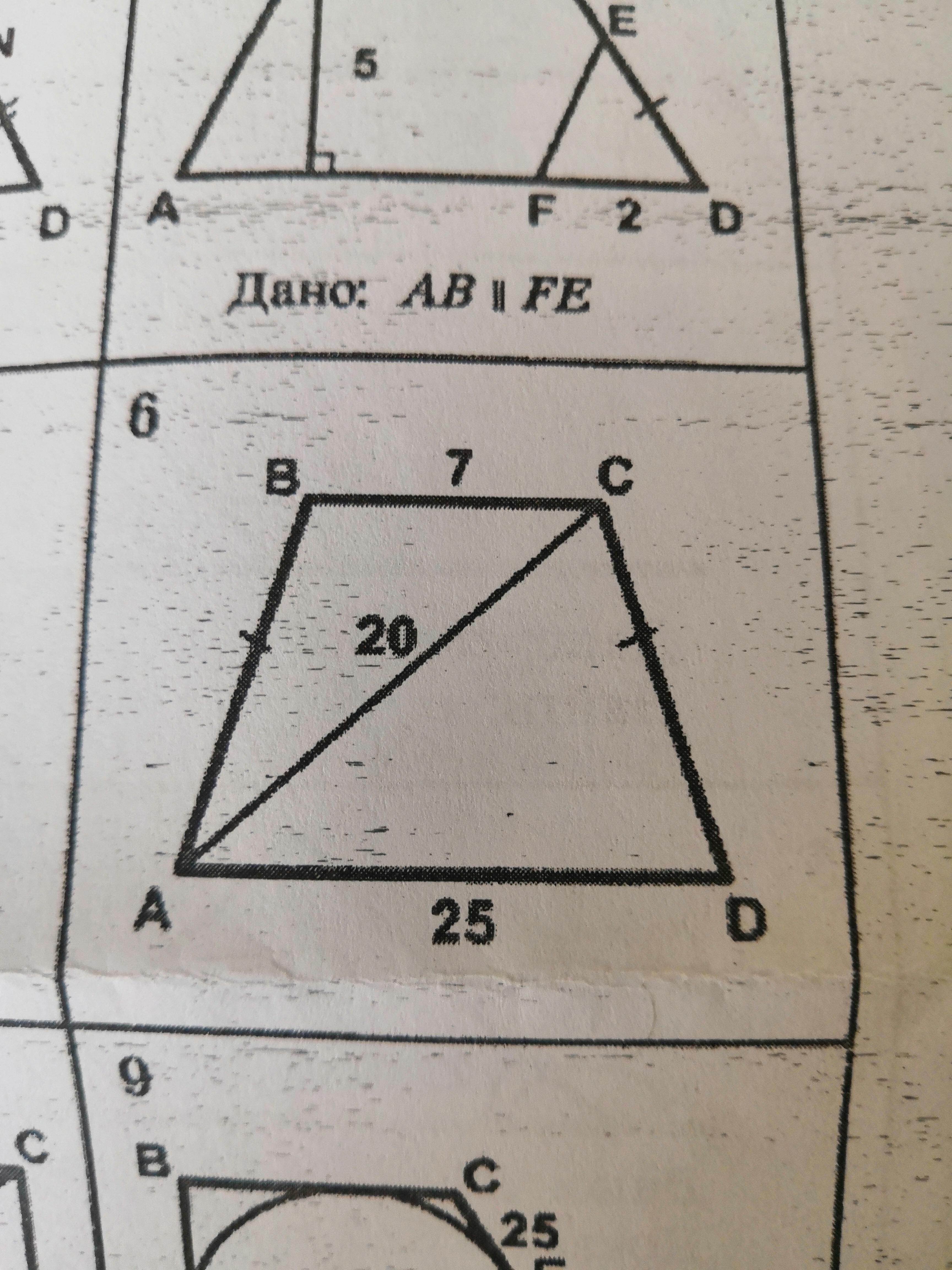 проведем высоту СО. Тогда СД=(25-7)/2=9, ОА=25-9=16. Из треугольника САО по теореме Пифагора найдем высоту СО= V(400-256)=12. Площадь трапеции равна (7+25)/2*12=192