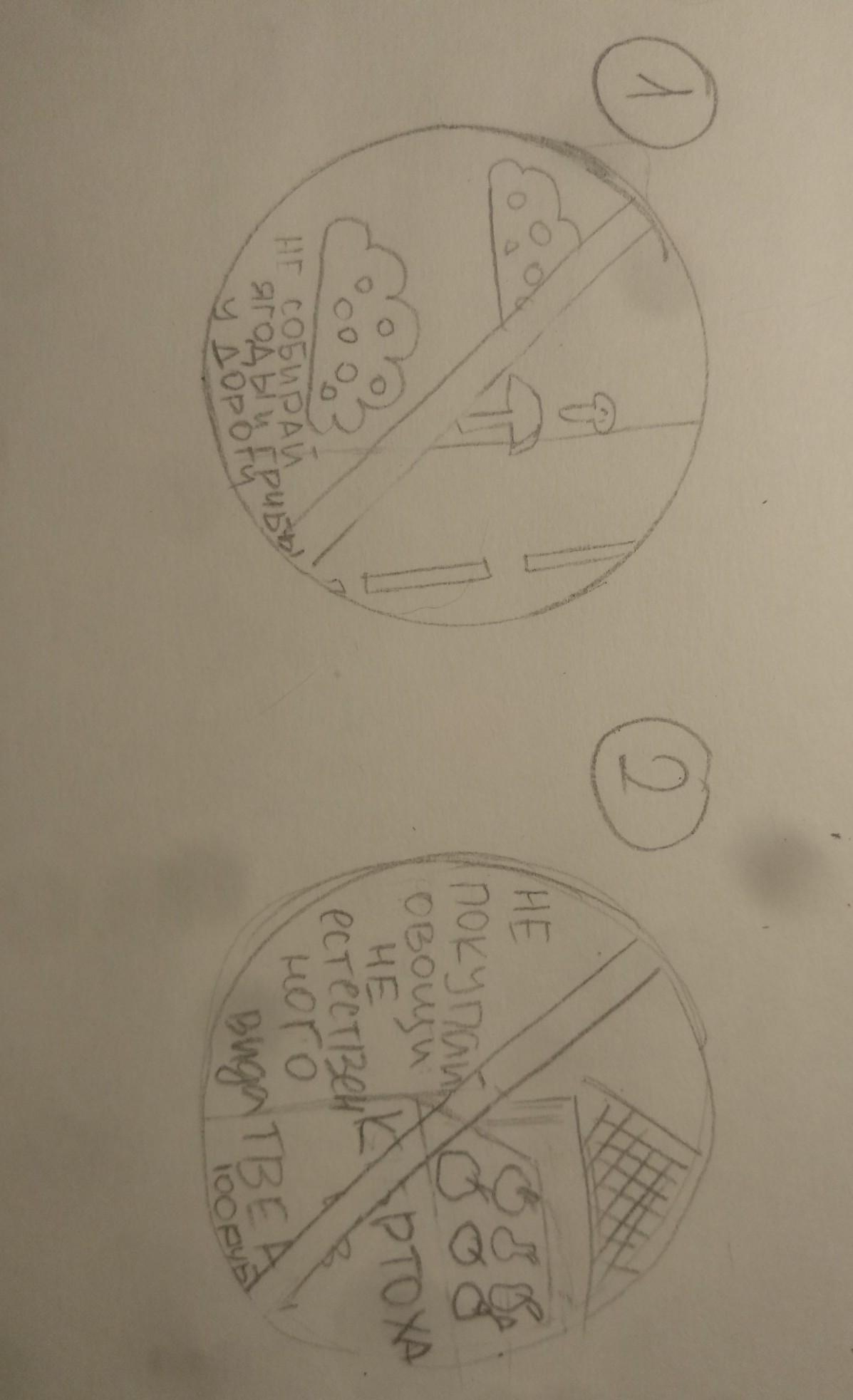 нарисовать знаки которые говорят, что не надо собирать грибы, ягоды и т.п. около дороги, и, что не нужно покупать овощи, фрукты не естественно вида
