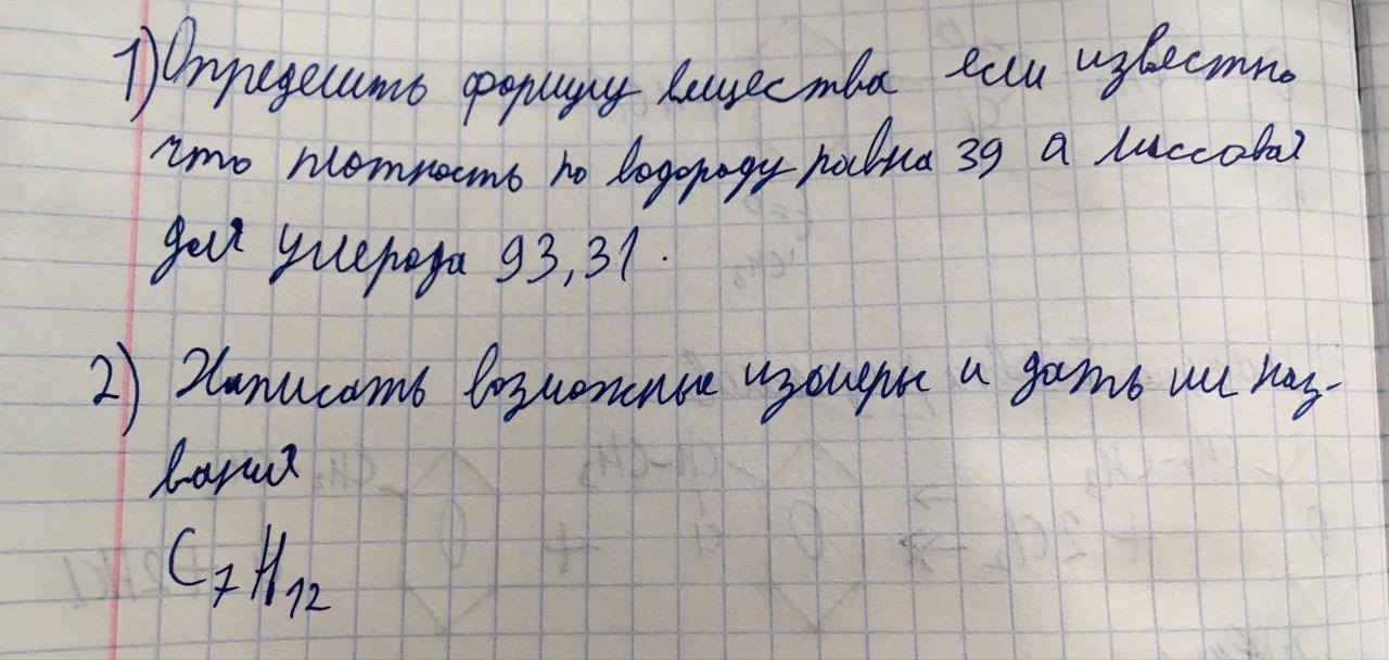 1) определить формулу вещества если известно что плотность по водороду равна 39, а массовая доля углерода 93,31