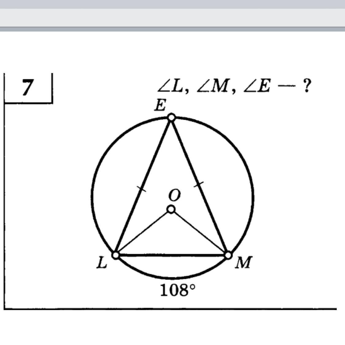 Угол Е вписанный, поэтому равен половине дуги, на которую опирается (дуга LM). Угол Е = 54 градуса. Треугольник LME - равнобедренный, значить угол М равен углу L, следовательно дуги LE и ME равны. Итак, дуга LE равна ME равно 2 делить на разность 360 градусов и 108 градусов, равно 126. Значит угол L равен углу M равно 63 градуса.